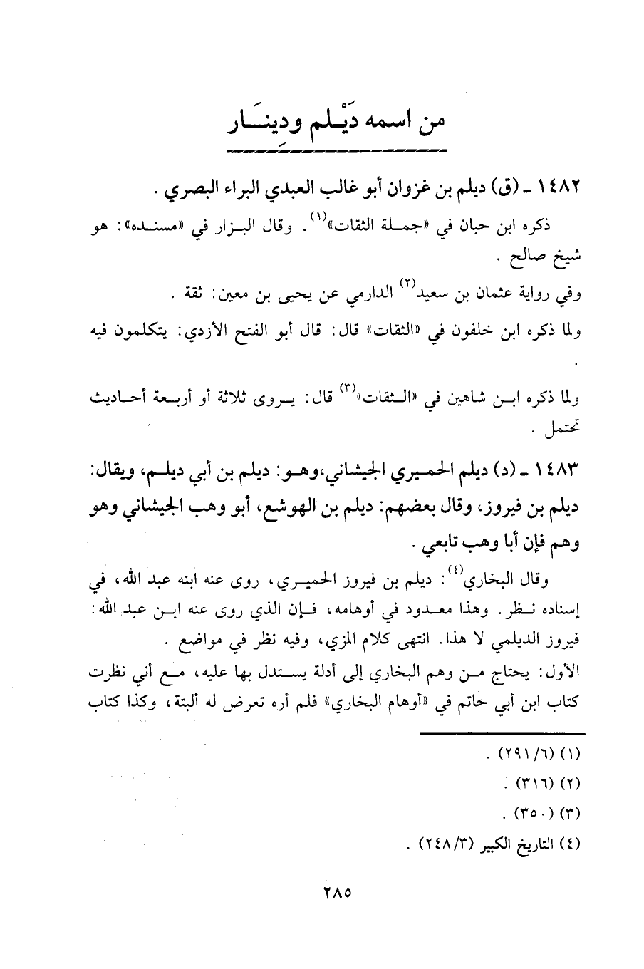 وقال البخاري: ديلم بن فيروز الحميري، روى عنه ابنه عبد الله، في إسناده نظر. وهذا معدود في أوهامه، فإن الذي روى عنه ابن عبد الله: فيروز الديلمي لا هذا. انتهى كلام المزي، وفيه نظر في مواضع.