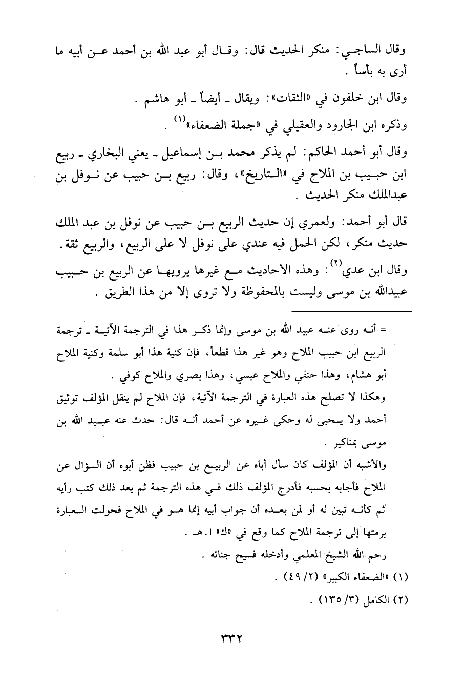 وقال أبو أحمد الحاكم: لم يذكر محمد بن إسماعيل - يعني البخاري - ربيع بن حبيب بن الملاح في «التاريخ»، وقال: ربيع بن حبيب عن نوفل بن عبد الملك منكر الحديث.