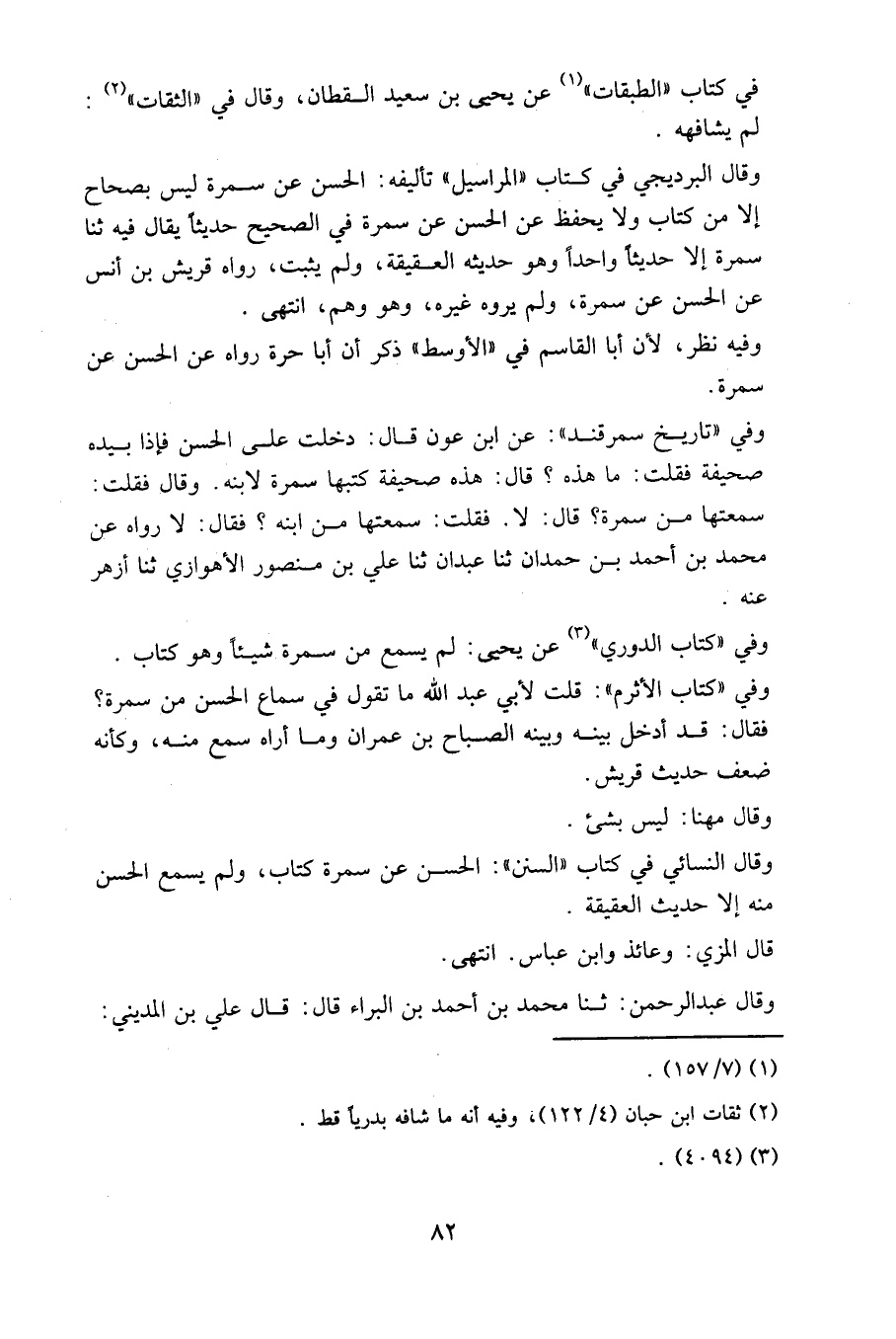 وقال البرديجي في كتاب «المراسيل» تأليفه: الحسن عن سمرة ليس بصحاح إلا من كتاب ولا