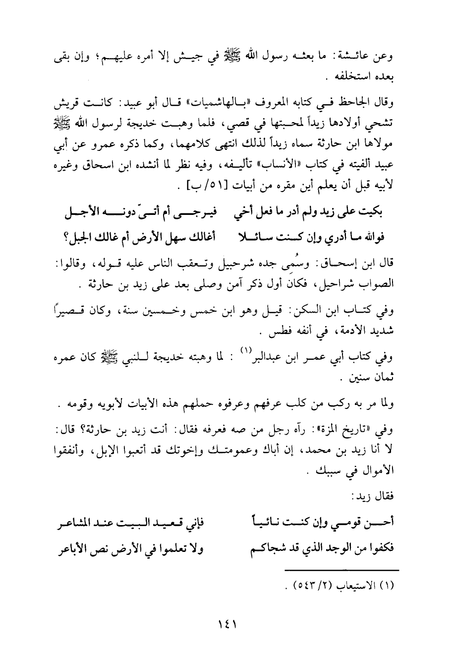 وقال الجاحظ في كتابه المعروف «بالهاشميات» قال أبو عبيد: كانت قريش تشحي أولادها زيدا لمحبتها في قصي، فلما وهبت خديجة لرسول الله صلى الله عليه وسلم مولاها ابن حارثة سماه زيدا لذلك انتهى كلامهما، وكما ذكره عمرو عن أبي عبيد ألفيته في كتاب «الأنساب» تأليفه، وفيه نظر لما أنشده ابن إسحاق وغيره لأبيه قبل أن يعلم أين مقره من أبيات [٥١ / ب].