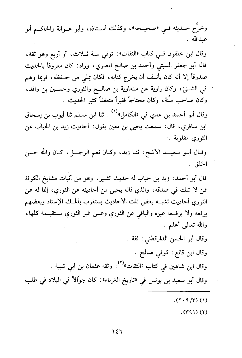قال أبو أحمد: زيد بن حباب له حديث كثير، وهو من أثبات مشايخ الكوفة ممن لا شك في صدقه، والذي قاله يحيى من أحاديثه عن الثوري، إنما له عن الثوري أحاديث تشبه بعض تلك الأحاديث يستغرب بذلك الإسناد وبعضهم يرفعه ولا يرفعه غيره والباقي عن الثوري وعن غير الثوري مستقيمة كلها، والله تعالى أعلم.