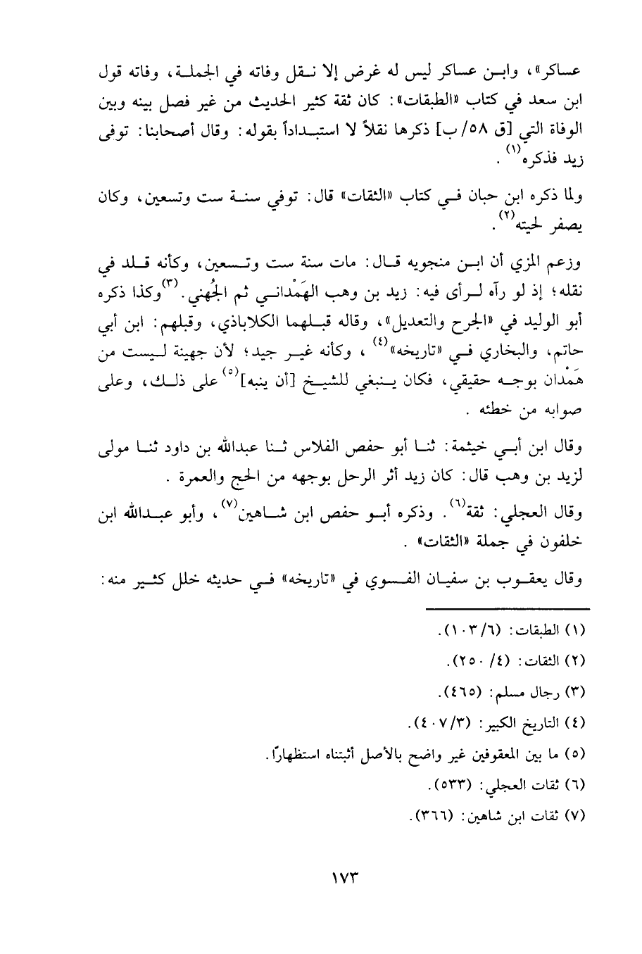 عساكر»، وابن عساكر ليس له غرض إلا نقل وفاته في الجملة، وفاته قول ابن سعد في كتاب «الطبقات»: كان ثقة كثير الحديث من غير فصل بينه وبين الوفاة التي [ق ٥٨ / ب] ذكرها نقلا لا استبدادا بقوله: وقال أصحابنا: توفي زيد فذكره.