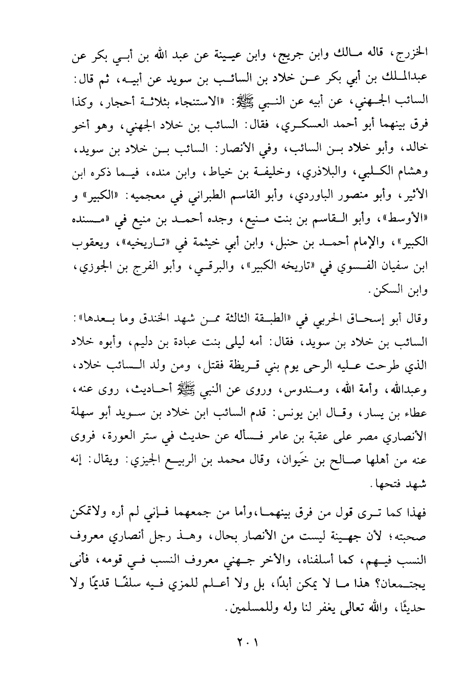 الخزرج، قاله مالك وابن جريج، وابن عيينة عن عبد الله بن أبي بكر عن عبد الملك بن أبي بكر عن خلاد بن السائب بن سويد عن أبيه، ثم قال: السائب الجهني، عن أبيه عن النبي صلى الله عليه وسلم: «الاستنجاء بثلاثة أحجار، وكذا فرق بينهما أبو أحمد العسكري، فقال: السائب بن خلاد الجهني، وهو أخو خالد، وأبو خلاد بن السائب، وفي الأنصار: السائب بن خلاد بن سويد، وهشام الكلبي، والبلاذري، وخليفة بن خياط، وابن منده، فيما ذكره ابن الأثير، وأبو منصور الباوردي، وأبو القاسم الطبراني في معجميه: «الكبير» و «الأوسط»، وأبو القاسم بن بنت منيع، وجده أحمد بن منيع في «مسنده الكبير»، والإمام أحمد بن حنبل، وابن أبي خيثمة في «تاريخيه»، ويعقوب بن سفيان الفسوي في «تاريخه الكبير»، والبرقي، وأبو الفرج بن الجوزي، وابن السكن.
