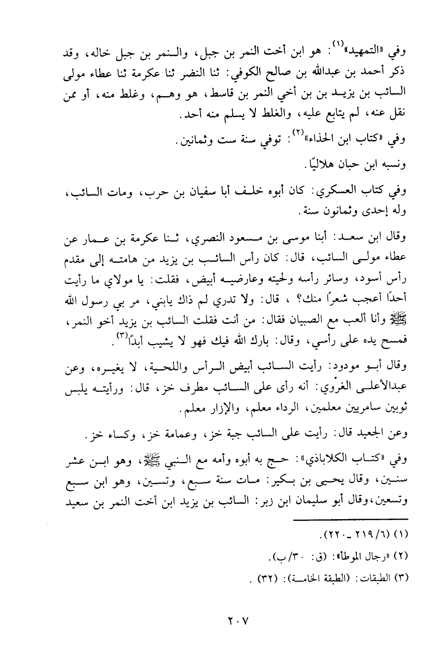 وفي «كتاب الكلاباذي»: حج به أبوه وأمه مع النبي صلى الله عليه وسلم، وهو ابن عشر سنين، وقال يحيى بن بكير: مات سنة سبع وتسعين، وهو ابن سبع وتسعين، وقال أبو سليمان ابن زبر: السائب بن يزيد ابن أخت النمر بن سعيد