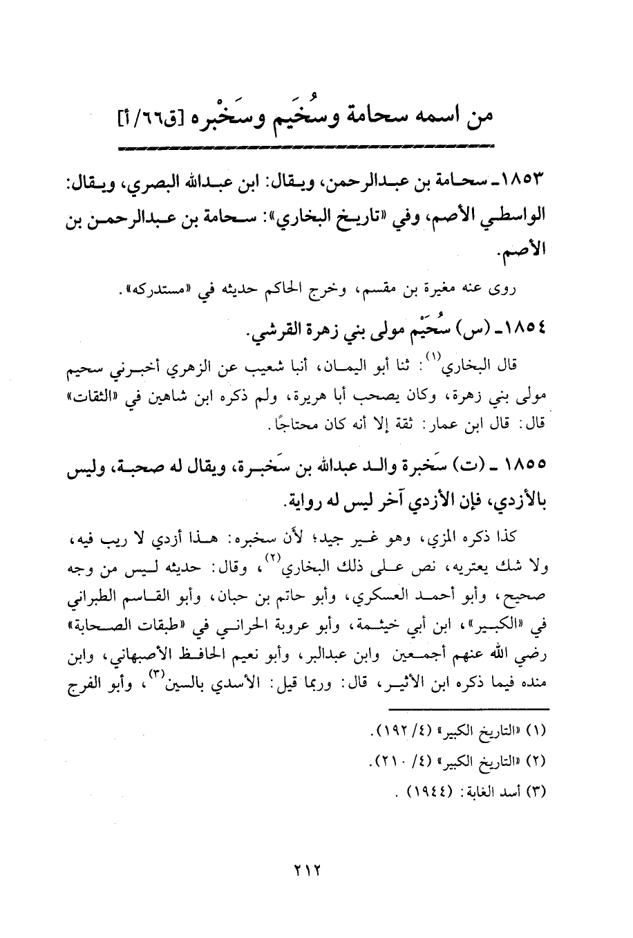 ١٨٥٣ - سحامة بن عبد الرحمن، ويقال: ابن عبد الله البصري، ويقال: الواسطي الأصم، وفي «تاريخ البخاري»: سحامة بن عبد الرحمن بن الأصم.
