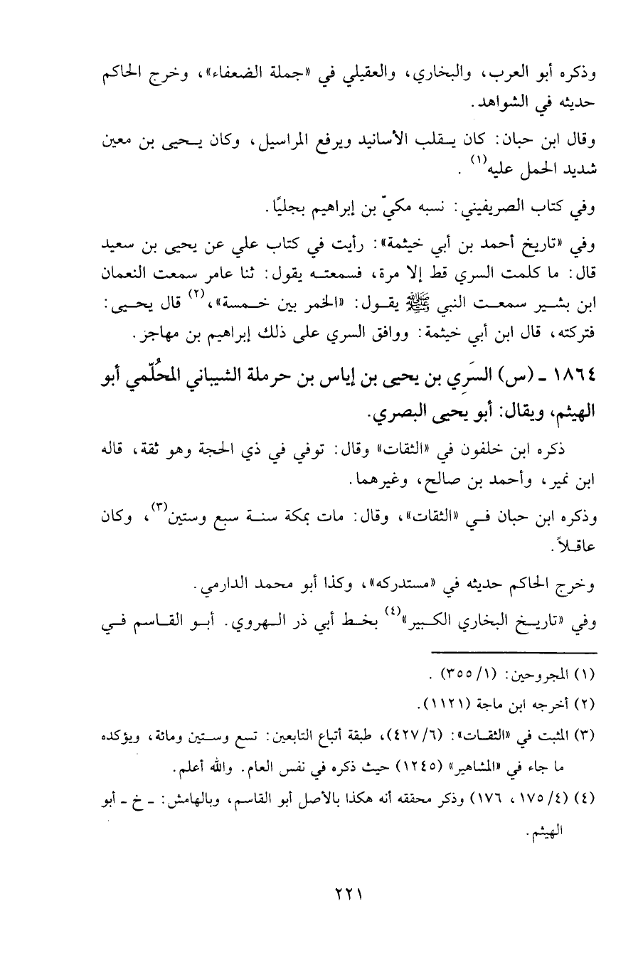 وفي «تاريخ أحمد بن أبي خيثمة»: رأيت في كتاب علي عن يحيى بن سعيد قال: ما كلمت السري قط إلا مرة، فسمعته يقول: ثنا عامر سمعت النعمان بن بشير سمعت النبي صلى الله عليه وسلم يقول: «الخمر بين خمسة»، قال يحيى: فتركته، قال ابن أبي خيثمة: ووافق السري على ذلك إبراهيم بن مهاجر.