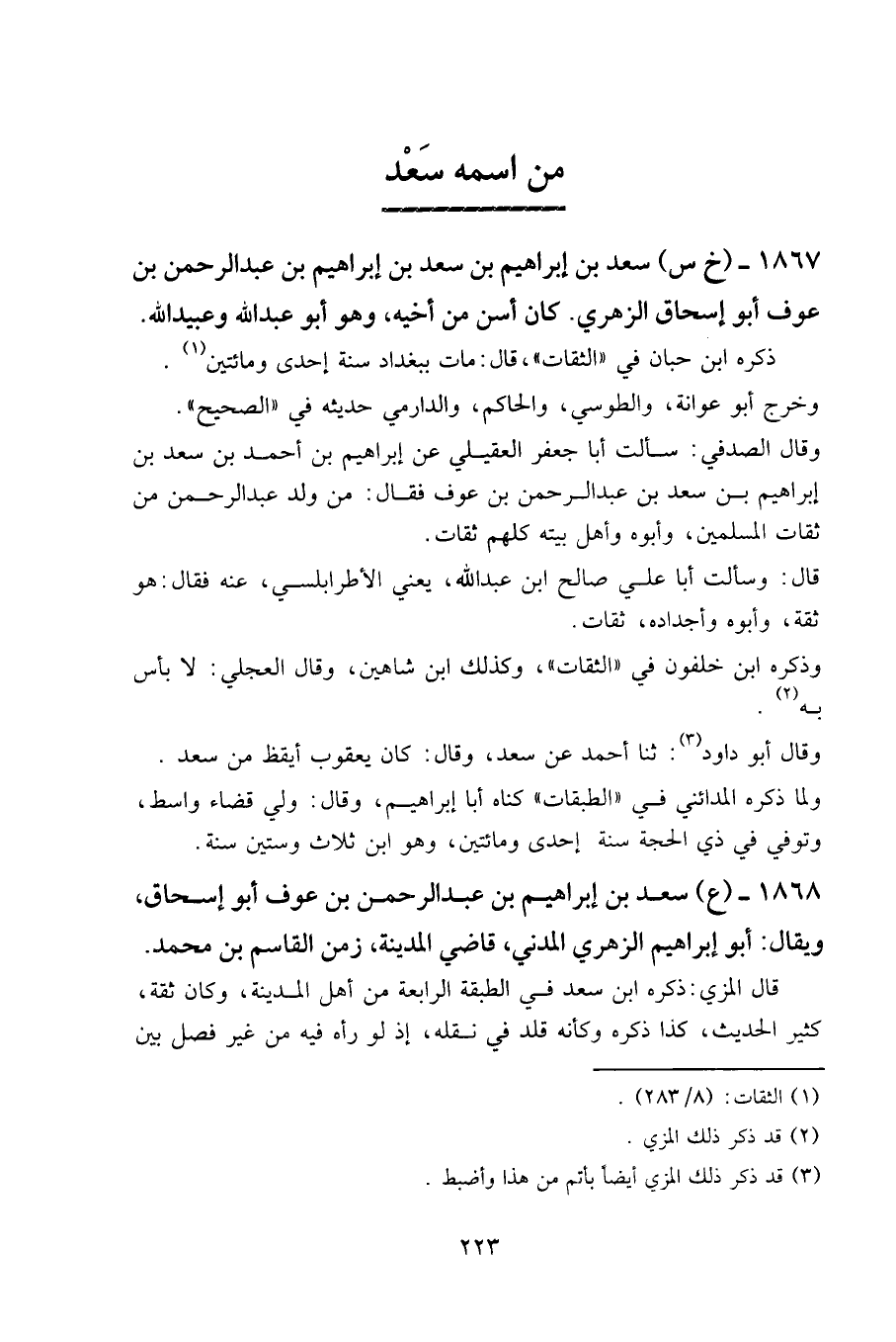 ١٨٦٧ - (خ س) سعد بن إبراهيم بن سعد بن إبراهيم بن عبد الرحمن بن عوف أبو إسحاق الزهري. كان أسن من أخيه، وهو أبو عبد الله وعبيد الله.