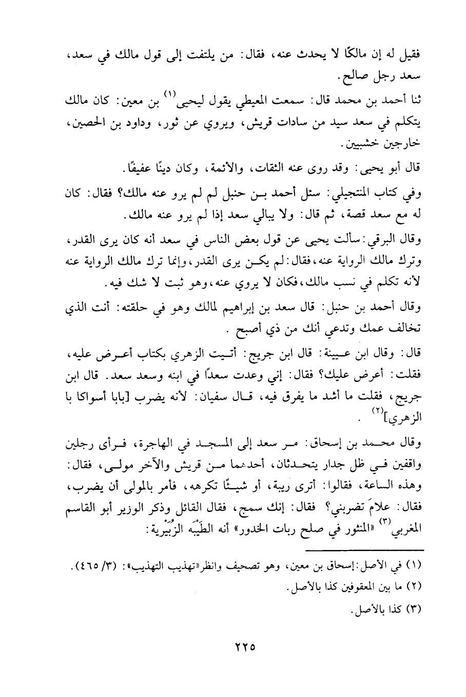 ثنا أحمد بن محمد قال: سمعت المعيطي يقول ليحيى بن معين: كان مالك يتكلم في سعد سيد من سادات قريش، ويروي عن ثور، وداود بن الحصين، خارجين خشبيين.