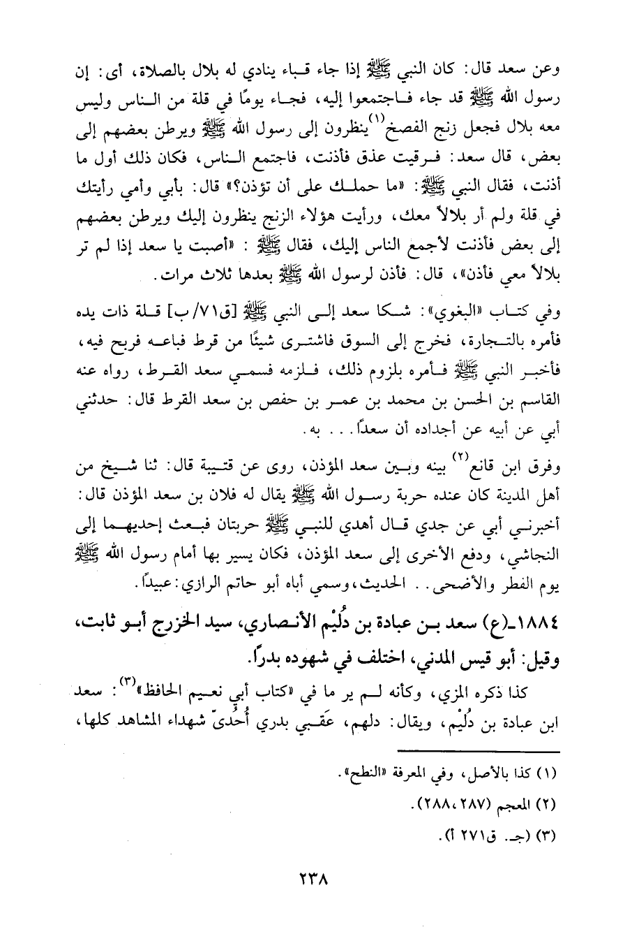 ١٨٨٤ - (ع) سعد بن عبادة بن دليم الأنصاري، سيد الخزرج أبو ثابت، وقيل: أبو قيس المدني، اختلف في شهوده بدرا.