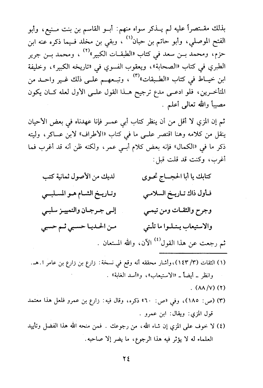 ثم إن المزي لا أقل من أن ينظر كتاب أبي عمر فإنا عهدناه في بعض الأحيان ينقل من كلامه وهنا اقتصر على ما في كتاب «الأطراف» لابن عساكر، وليته ذكر ما في «الكمال» فإنه بعض كلام أبي عمر، ولكنه ظن أنه قد أغرب فما أغرب، وكنت قد قلت قبل: