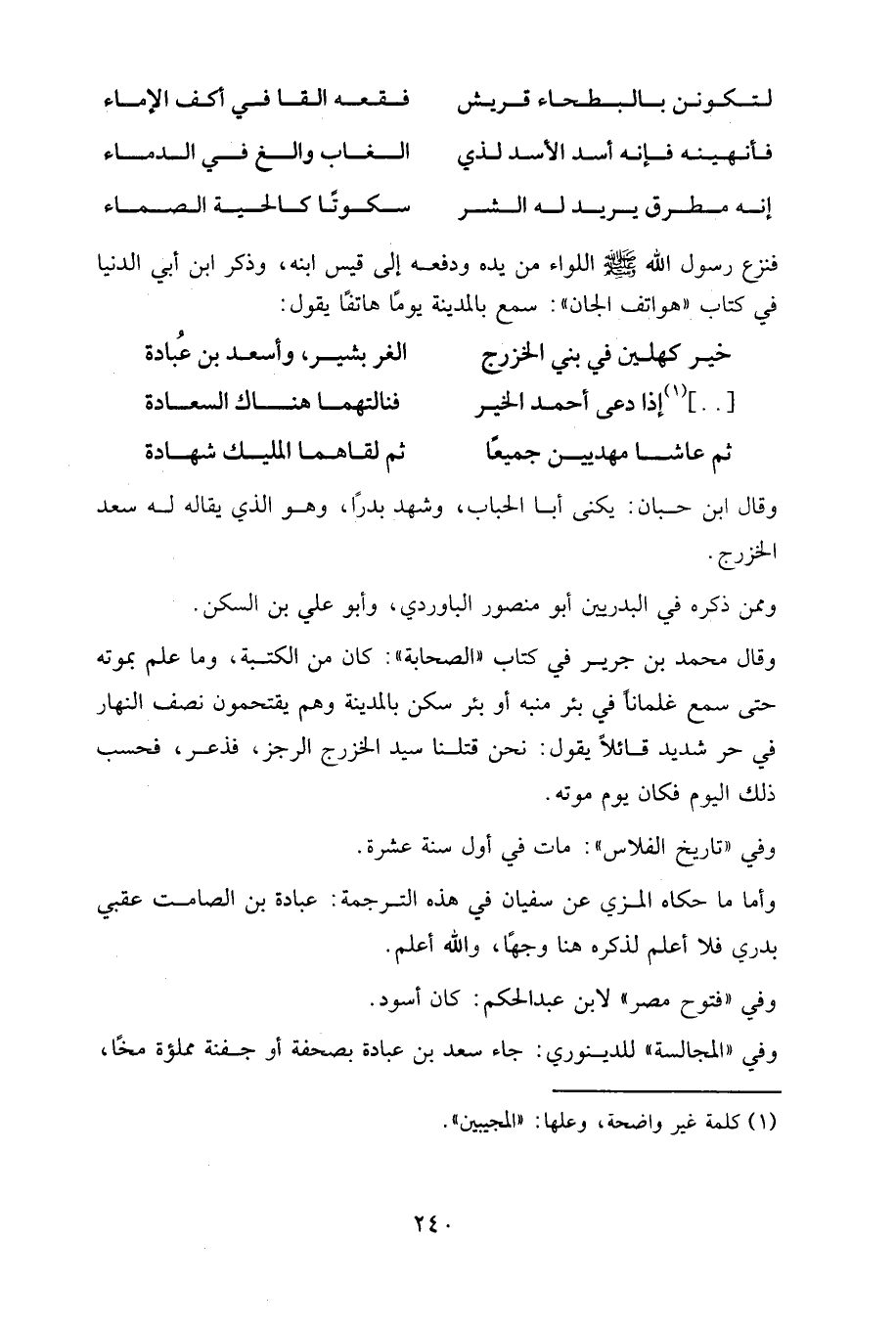فنزل رسول الله صلى الله عليه وسلم اللواء من يده ودفعه إلى قيس ابنه، وذكر ابن أبي الدنيا في كتاب «هواتف الجان»: سمع بالمدينة يوما هاتفا يقول: