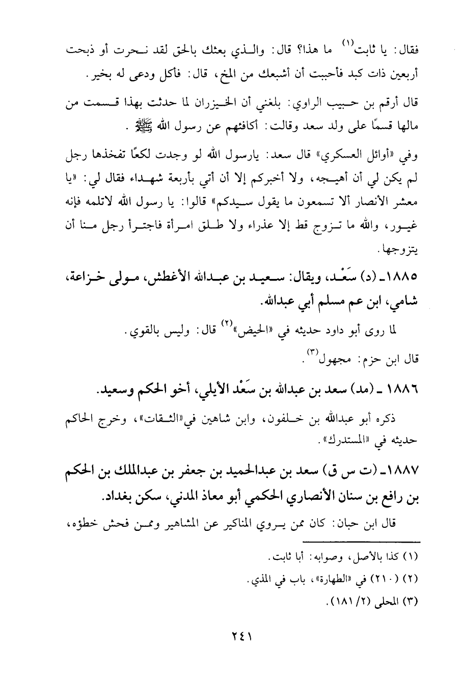 ١٨٨٧ - (ت س ق) سعد بن عبد الحميد بن جعفر بن عبد الملك بن الحكم بن رافع بن سنان الأنصاري الحكمي أبو معاذ المدني، سكن بغداد.