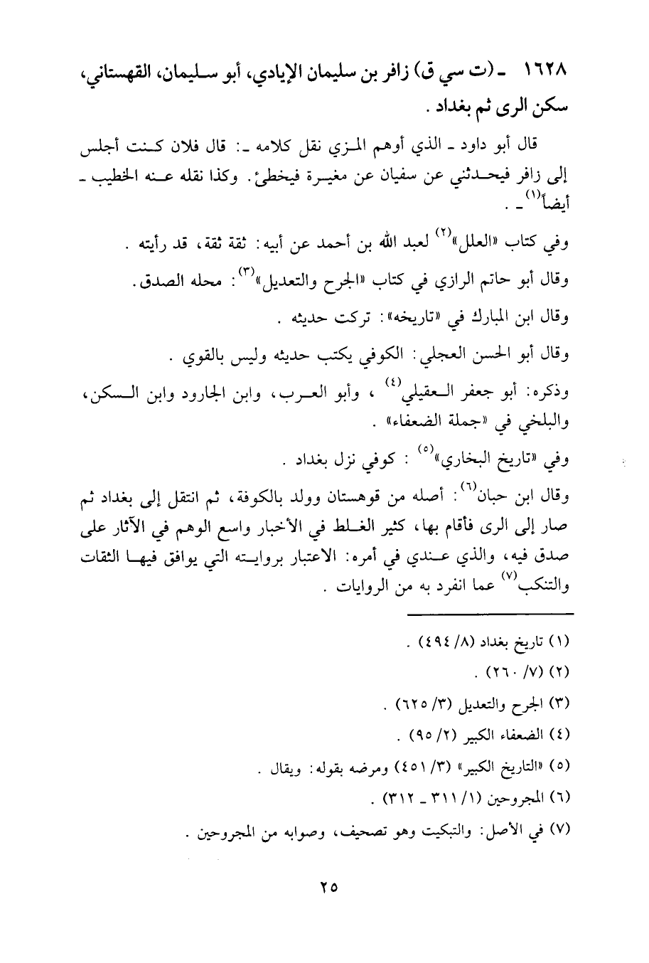 قال أبو داود- الذي أوهم المزي نقل كلامه-: قال فلان كنت أجلس إلى زافر فيحدثني عن سفيان عن مغيرة فيخطئ. وكذا نقله عنه الخطيب- أيضا-.