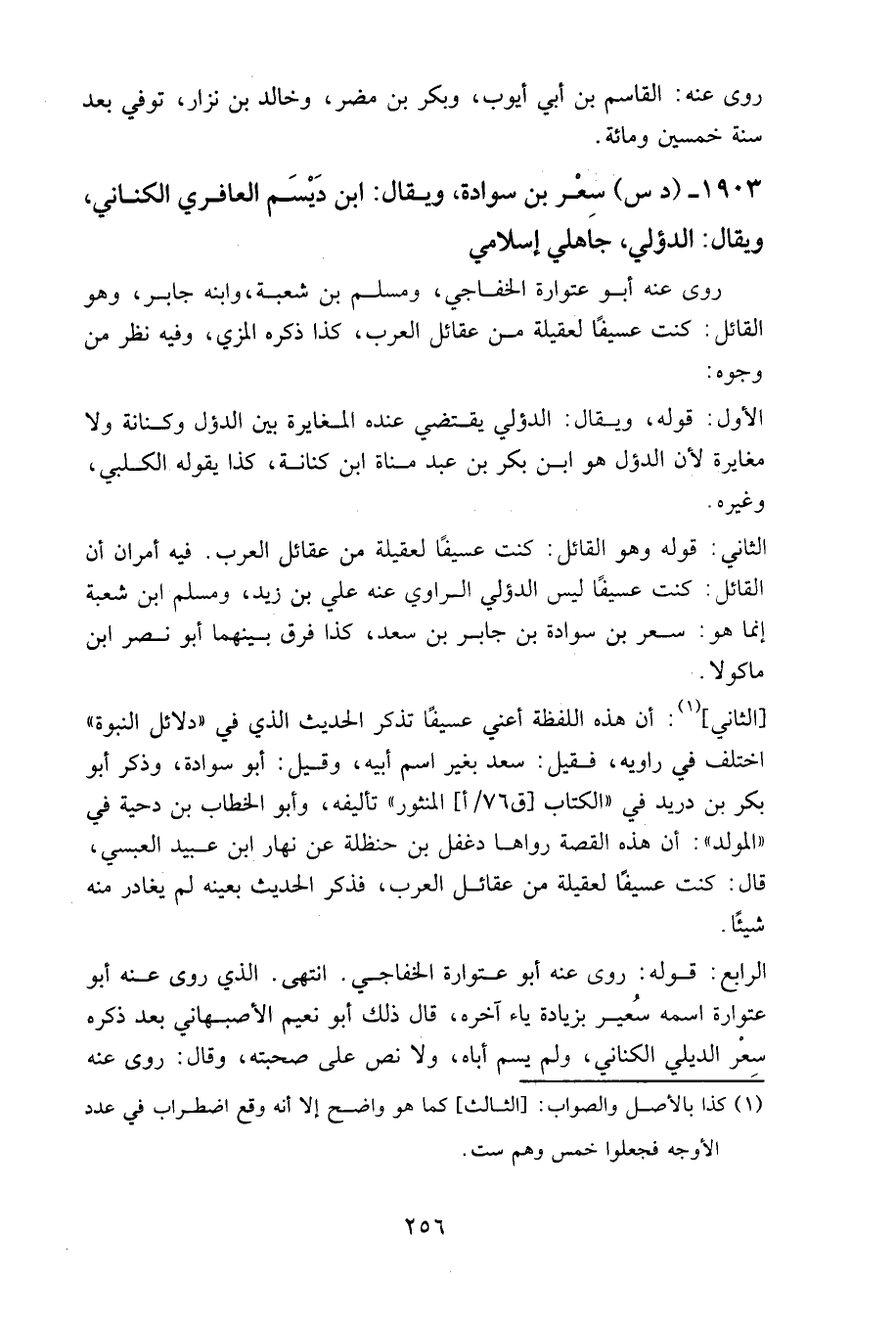 الثاني: قوله وهو القائل: كنت عسيفا لعقيلة من عقائل العرب. فيه أمران أن القائل: كنت عسيفا ليس الدؤلي الراوي عنه علي بن زيد، ومسلم ابن شعبة إنما هو: سعر بن سوادة بن جابر بن سعد، كذا فرق بينهما أبو نصر ابن ماكولا.