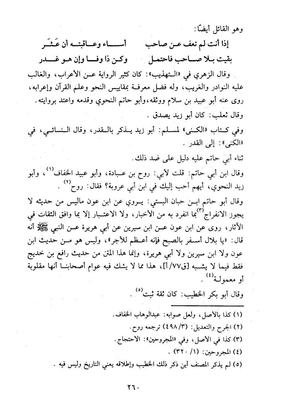 وقال أبو حاتم ابن حبان البستي: يروي عن ابن عون ما ليس من حديثه لا يجوز الانفراج بما انفرد به من الأخبار، ولا الاعتبار إلا بما وافق الثقات في الآثار، روى عن ابن عون عن ابن سيرين عن أبي هريرة عن النبي صلى الله عليه وسلم أنه قال: «يا بلال أسفر بالصبح فإنه أعظم للأجر»، وليس هو من حديث ابن عون ولا ابن سيرين ولا أبي هريرة، وإنما هذا المتن من حديث رافع بن خديج فقط فيما لا يشبه [ق ٧٧ / أ]، هذا مما لا يشك فيه عوام أصحابنا أنها مقلوبة أو معمولة.