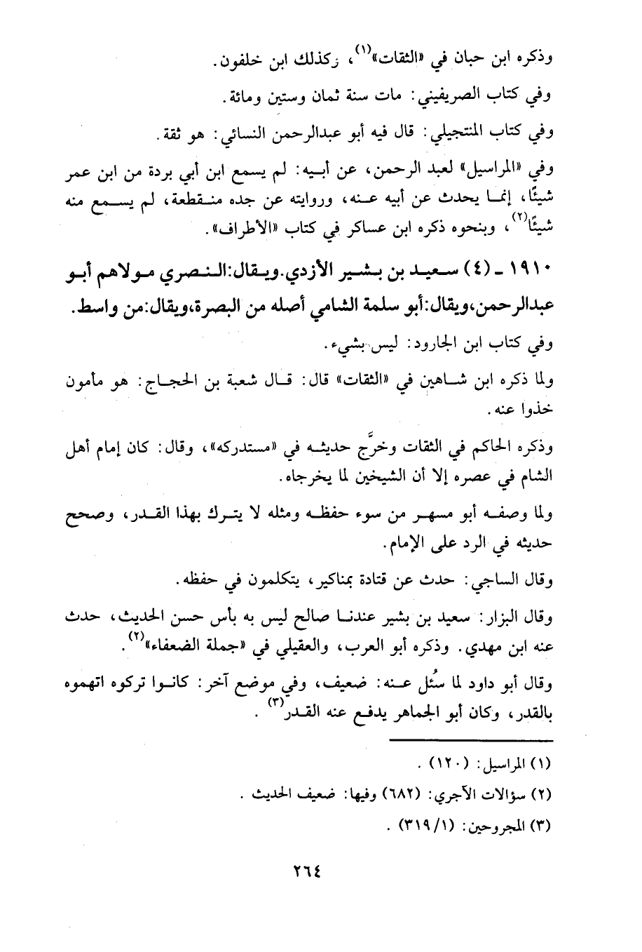 ١٩١٠ - (٤) سعيد بن بشير الأزدي. ويقال: النصري مولاهم أبو عبد الرحمن، ويقال: أبو سلمة الشامي أصله من البصرة، ويقال: من واسط.