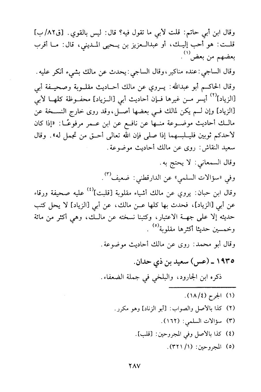 وقال ابن حبان: يروي عن مالك أشياء مقلوبة (قلبت) عليه صحيفة ورقاء عن أبي (الزياد)، فحدث بها كلها عن مالك، عن أبي (الزياد) لا يحل كتب حديثه إلا على جهة الاعتبار، وكتبنا نسخته عن مالك، وهي أكثر من مائة وخمسين حديثا أكثرها مقلوبة.