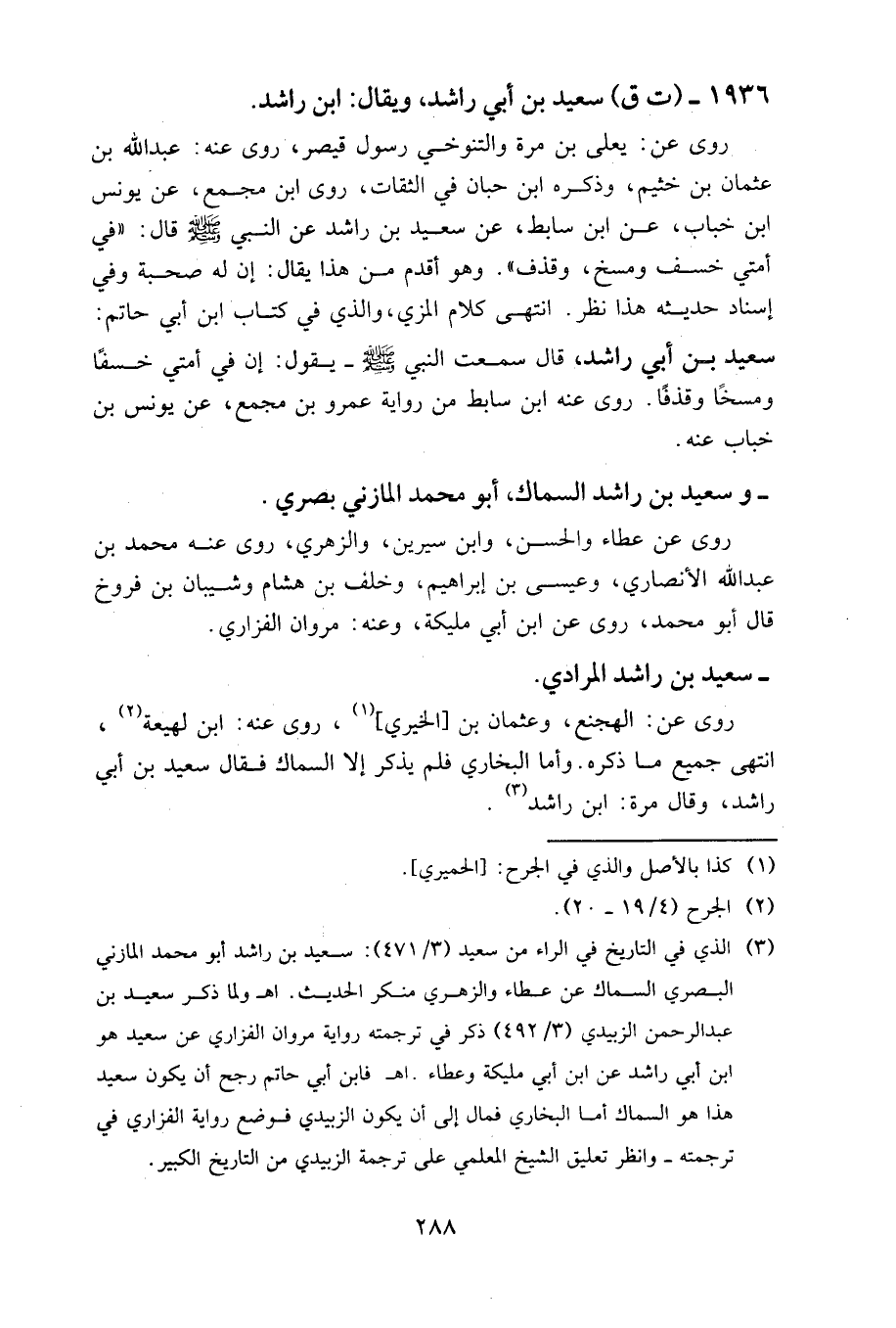 روى عن: يعلى بن مرة والتنوخي رسول قيصر، روى عنه: عبد الله بن عثمان بن خثيم، وذكره ابن حبان في الثقات، روى ابن مجمع، عن يونس بن خباب، عن ابن سابط، عن سعيد بن راشد عن النبي صلى الله عليه وسلم قال: «في أمتي خسف ومسخ، وقذف». وهو أقدم من هذا يقال: إن له صحبة وفي إسناد حديثه هذا نظر. انتهى كلام المزي، والذي في كتاب ابن أبي حاتم: سعيد بن أبي راشد، قال سمعت النبي صلى الله عليه وسلم- يقول: إن في أمتي خسفا ومسخا وقذفا. روى عنه ابن سابط من رواية عمرو بن مجمع، عن يونس بن خباب عنه.
