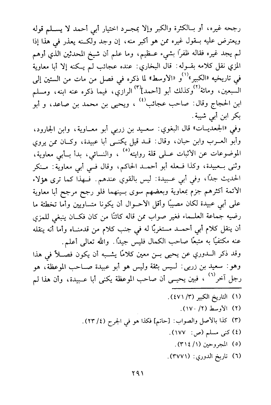 وفي «الجعديات» قال البغوي: سعيد بن زربي أبو معاوية، وابن الجارود، وأبو العرب وابن حبان، وقال: قد قيل يكنى أبا عبيدة، وكان ممن يروي الموضوعات عن الأثبات على قلة روايته، والنسائي بدأ بأبي معاوية، وثنى بعبيدة، وكذا فعله أبو أحمد الحاكم، وقال في أبي معاوية: منكر الحديث جدا، وفي أبي عبيدة: ليس بالقوي عندهم. فهذا كما ترى هؤلاء الأئمة أكثرهم جزم بمعاوية وبعضهم سوى بينهما فلو رجح مرجح أبا معاوية على أبي عبيدة لكان مصيبا وأقل الأحوال أن يكونا متساويين وأما تخطئة ما رضيه جماعة العلماء فغير صواب ممن قاله كائنا من كان فكان ينبغي للمزي أن ينقل كلام أبي أحمد مستغربا له في جنب كلام من قدمناه وأما أنه ينقله عنه مكتفيا به متبعا صاحب الكمال فليس جيدا. والله تعالى أعلم.
