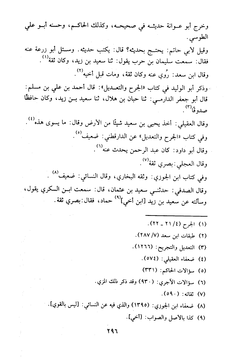 وذكر أبو الوليد في كتاب «الجرح والتعديل»: قال أحمد بن علي بن مسلم: قال أبو جعفر الدارمي: ثنا حبان بن هلال، ثنا سعيد بن زيد، وكان حافظا صدوقا.