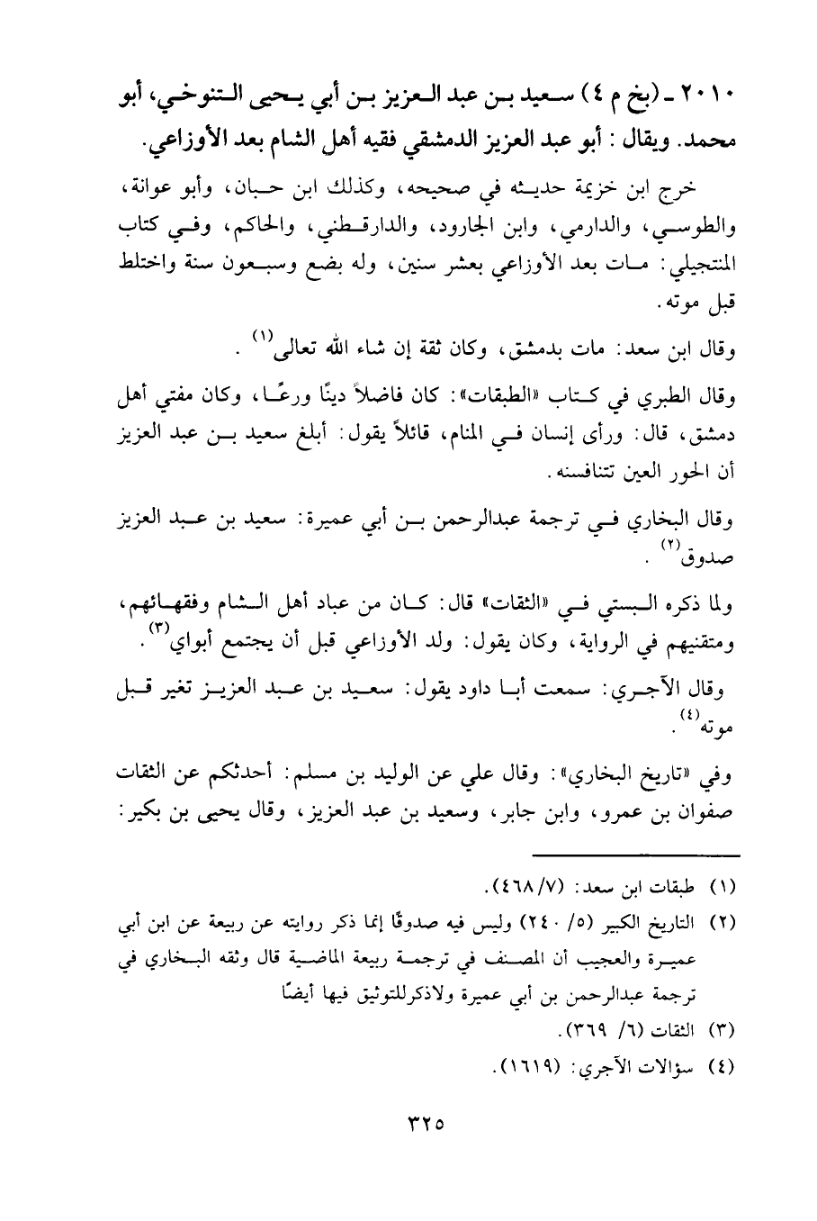 ٢٠١٠ - (بخ م ٤) سعيد بن عبد العزيز بن أبي يحيى التنوخي، أبو محمد. ويقال: أبو عبد العزيز الدمشقي فقيه أهل الشام بعد الأوزاعي.