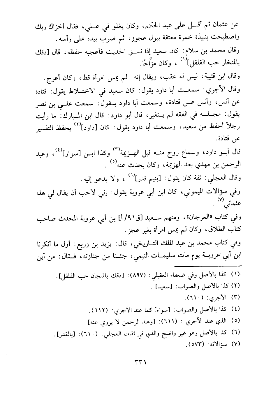 وفي كتاب «العرجان»، ومنهم سعيد [ق ٩١ / أ] بن أبي عروبة المحدث صاحب كتاب الطلاق، وكان لم يمس امرأة بغير عجز.