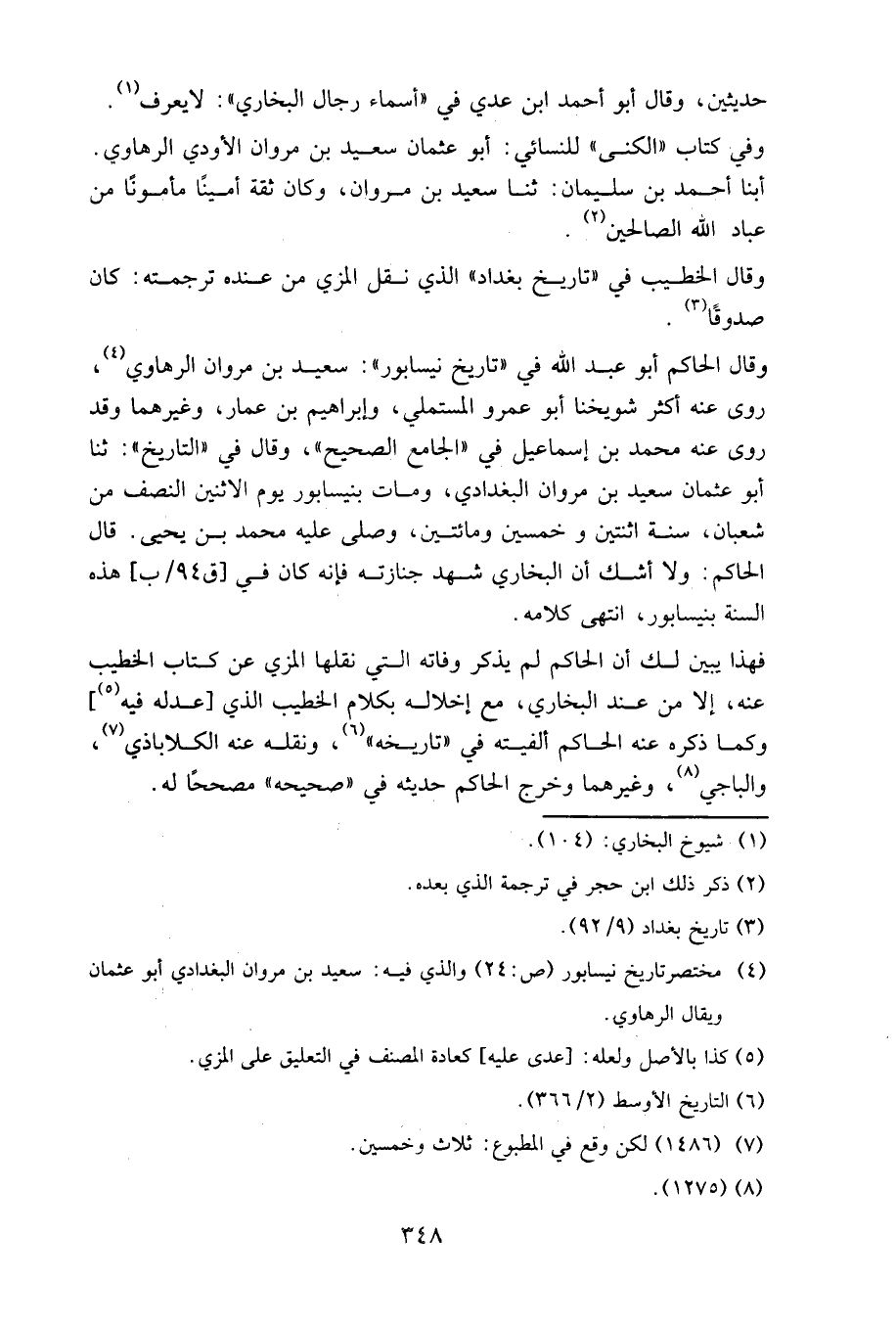 وقال الحاكم أبو عبد الله في «تاريخ نيسابور»: سعيد بن مروان الرهاوي، روى عنه أكثر شويخنا أبو عمرو المستملي، وإبراهيم بن عمار، وغيرهما وقد روى عنه محمد بن إسماعيل في «الجامع الصحيح»، وقال في «التاريخ»: ثنا أبو عثمان سعيد بن مروان البغدادي، ومات بنيسابور يوم الاثنين النصف من شعبان، سنة اثنتين وخمسين ومائتين، وصلى عليه محمد بن يحيى. قال الحاكم: ولا أشك أن البخاري شهد جنازته فإنه كان في [ق ٩٤ / ب] هذه السنة بنيسابور، انتهى كلامه.
