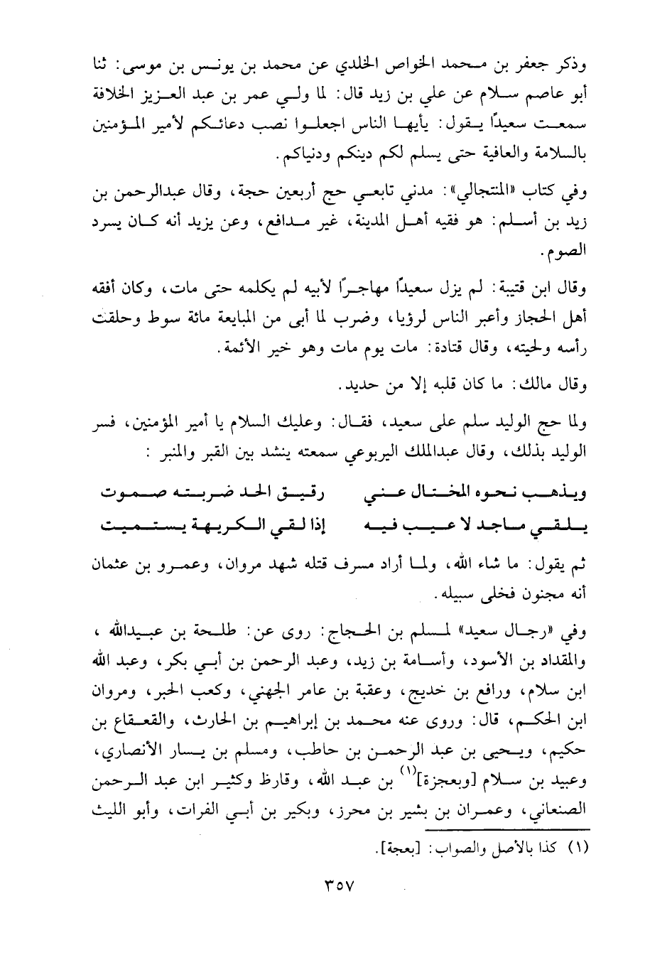 ولما حج الوليد سلم على سعيد، فقال: وعليك السلام يا أمير المؤمنين، فسر الوليد بذلك، وقال عبد الملك اليربوعي سمعته ينشد بين القبر والمنبر:
