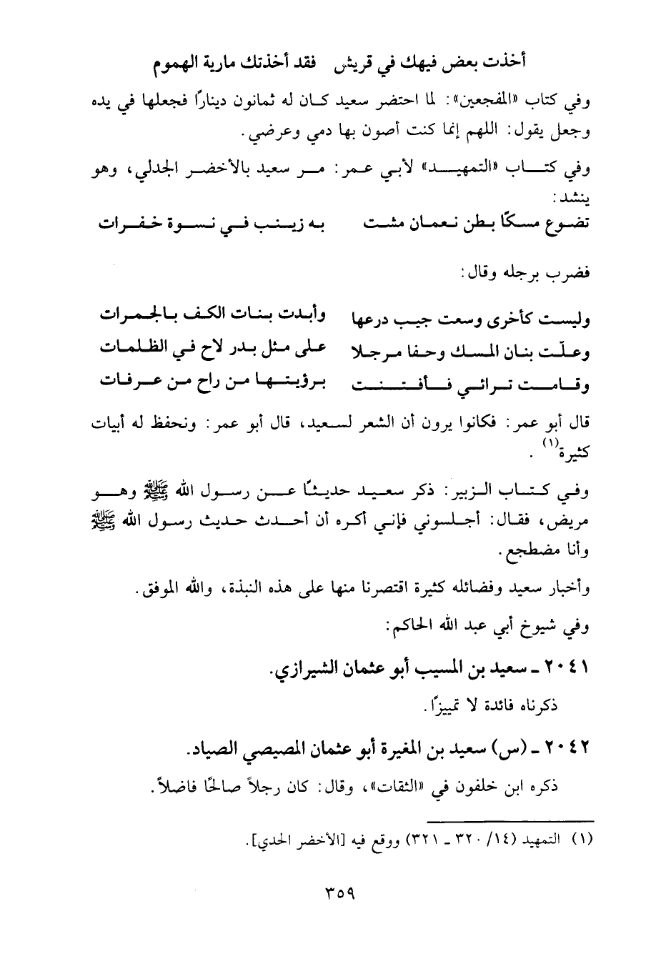 قال أبو عمر: فكانوا يرون أن الشعر لسعيد، قال أبو عمر: ونحفظ له أبياتا كثيرة.