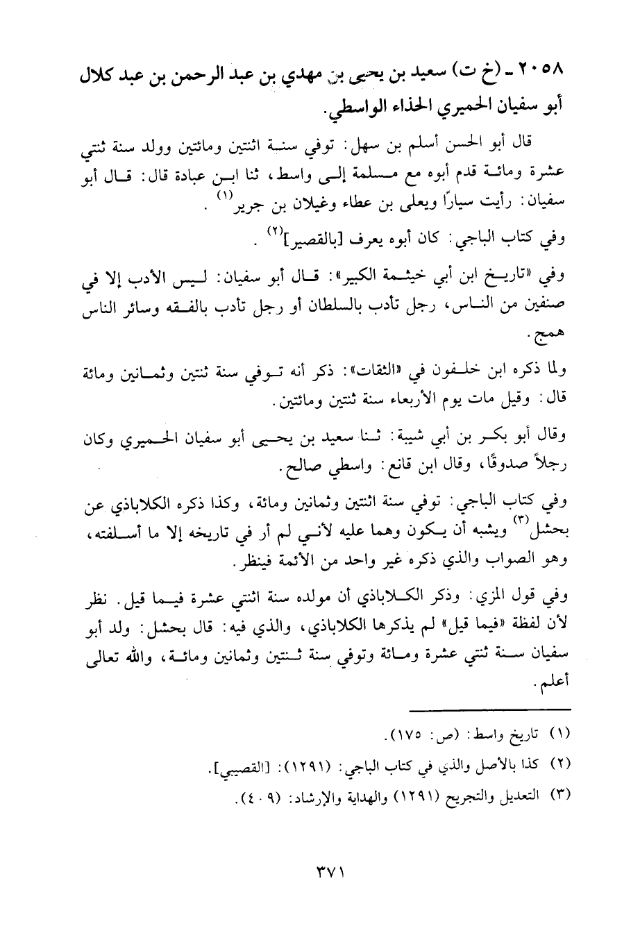 ٢٠٥٨ - (خ ت) سعيد بن يحيى بن مهدي بن عبد الرحمن بن عبد كلال أبو سفيان الحميري الحذاء الواسطي.