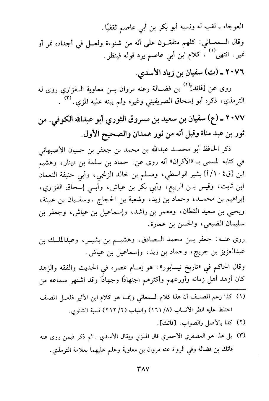 ٢٠٧٧ - (ع) سفيان بن سعيد بن مسروق الثوري أبو عبد الله الكوفي. من ثور بن عبد مناة وقيل إنه من ثور همدان والصحيح الأول.