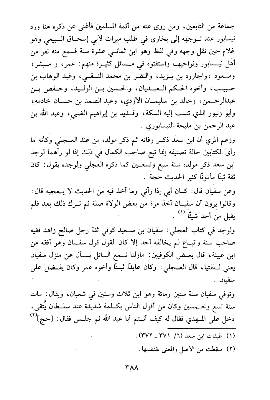 ولوجد في كتاب العجلي: سفيان بن سعيد كوفي ثقة رجل صالح زاهد فقيه صاحب سنة واتباع لم يخالفه أحد إلا كان القول قول سفيان وهو أفقه من ابن عيينة، قال بعض الكوفيين: ما زلنا نسمع السائل يسأل عن منزل سفيان يعني للفتيا، قال العجلي: وكان عابدا ثبتا وأخوه عمر وكان يفضل على سفيان.