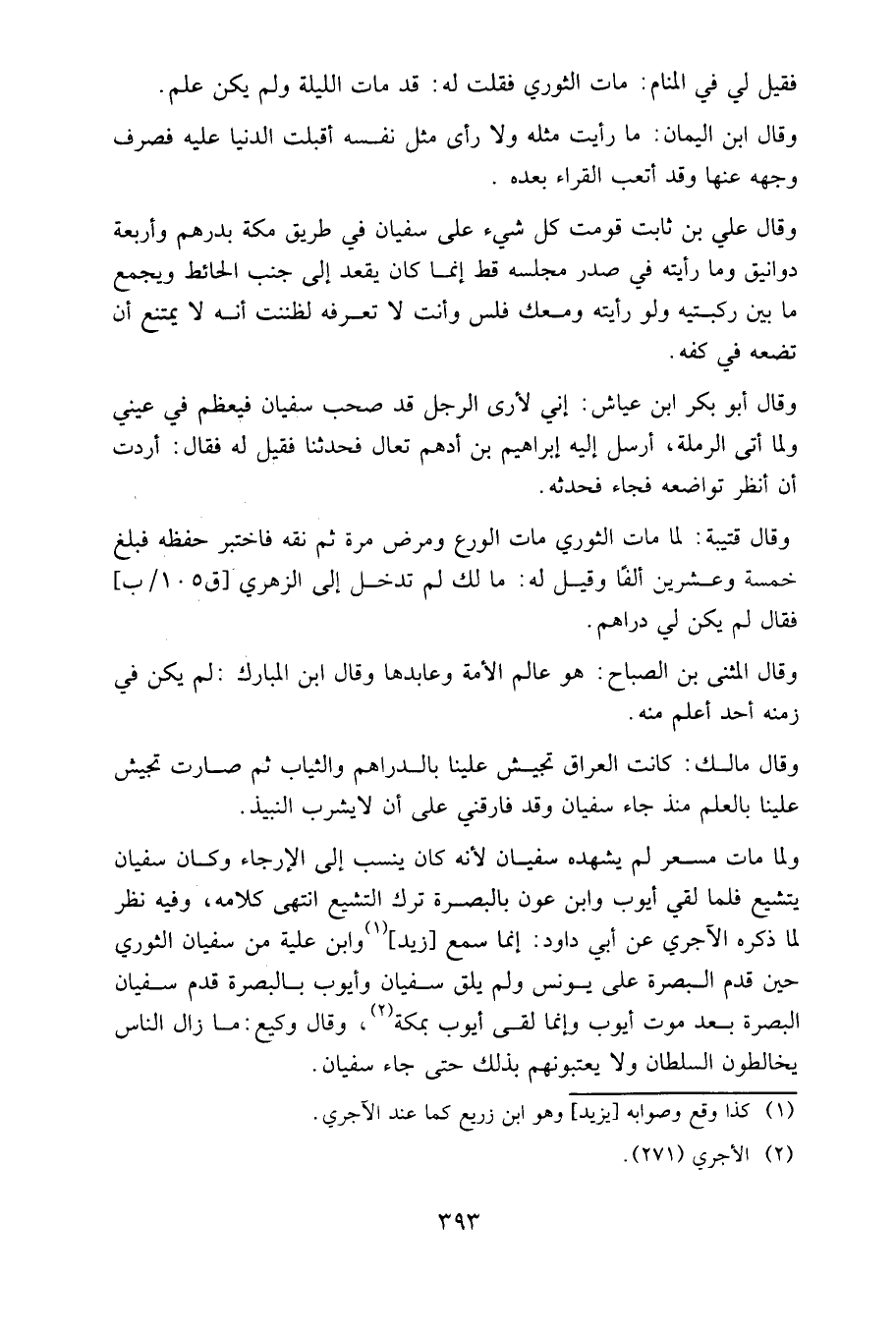 ولما مات مسعر لم يشهده سفيان لأنه كان ينسب إلى الإرجاء وكان سفيان يتشيع فلما لقي أيوب وابن عون بالبصرة ترك التشيع انتهى كلامه، وفيه نظر لما ذكره الآجري عن أبي داود: إنما سمع (زيد) وابن علية من سفيان الثوري حين قدم البصرة على يونس ولم يلق سفيان وأيوب بالبصرة قدم سفيان البصرة بعد موت أيوب وإنما لقي أيوب بمكة، وقال وكيع: ما زال الناس يخالطون السلطان ولا يعتبونهم بذلك حتى جاء سفيان.