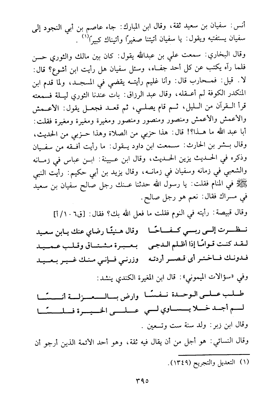 أنس: سفيان بن سعيد ثقة، وقال ابن المبارك: جاء عاصم بن أبي النجود إلى سفيان يستفتيه ويقول: يا سفيان أتيتنا صغيرا وأتيناك كبيرا.