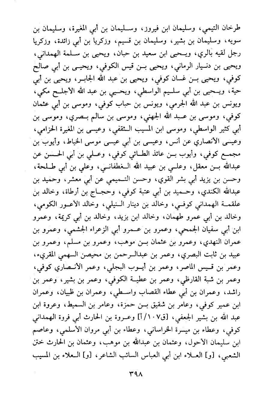 طرخان التيمي، وسليمان ابن فيروز، وسليمان بن أبي المغيرة، وسليمان بن سويه، وسليمان بن بشير، وسليمان بن قسيم، وزكريا بن أبي زائدة، وزكريا رجل لقيه بالري، ويحيى ابن سعيد بن حبان، ويحيى بن سلمة الهمداني، ويحيى بن دنيار الرماني، ويحيى بن قيس الكوفي، ويحيى بن أبي صالح كوفي، ويحيى بن غسان كوفي، ويحيى بن عبد الله الجابر، ويحيى بن أبي حية، ويحيى بن أبي سليم الواسطي، ويحيى بن عبد الله الأجلح مكي، ويونس بن عبد الله الجرمي، ويونس بن حباب كوفي، وموسى بن أبي عثمان كوفي، وموسى بن عبد الله الجهني، وموسى بن سالم بصري، وموسى بن أبي كثير الواسطي، وموسى ابن المسيب الثقفي، وعيسى بن المغيرة الحزامي، وعيسى الأنصاري عن أنس، وعيسى بن أبي عيسى موسى الخياط، وأيوب بن مجمع كوفي، وأيوب بن عائذ الطائي كوفي، وعلي بن أبي الحسن عن عبد الله بن معقل، وعلي بن عبيد الله الغطفاني، وعلي بن أبي طلحة، وحسن بن يزيد أبي بشر القوي، وحسن التميمي عن أبي معشر، وحميد بن عبد الله الكندي، وحميد بن أبي عتبة كوفي، وحجاج بن أرطاة، وخالد بن علقمة الهمداني كوفي، وخالد بن دينار النيلي، وخالد الأعور الكومي، وخالد بن أبي عمرو طهمان، وخالد ابن يزيد، وخالد بن أبي كريمة، وعمرو بن أبي سفيان الجمحي، وعمرو بن عمرو أبي الزعراء الجشمي، وعمرو بن عمران النهدي، وعمرو بن عثمان بن موهب، وعمرو بن مسلم، وعمرو بن عبيد بن ثابت البصري، وعمر بن عبد الرحمن بن محيصن السهمي المقرئ، وعمر بن قيس الماصر، وعمر بن أيوب البجلي، وعمر الأنصاري كوفي، وعمر بن شبة القارظي، وعمر بن عطية الكوفي، وعمر بن بشير، وعمر بن راشد، وعمران بن أبي عطاء القصاب واسطي، وعمران بن ظبيان، وعمران بن عمير كوفي، وعامر بن شقيق بن حمزة، وعامر بن السميط، وعروة ابن عبد الله بن بشير الجعفي، [ق ١٠٧ / أ] وعروة بن الحارث أبي فروة الهمداني كوفي، وعطاء بن ميسرة الخراساني، وعطاء بن أبي مروان الأسلمي، وعاصم بن سليمان الأحول، وعثمان بن عبد الله بن موهب، وعثمان بن الحارث ختن الشعبي، (و) العلاء ابن أبي العباس السائب الشاعر، (و) العلاء بن المسيب