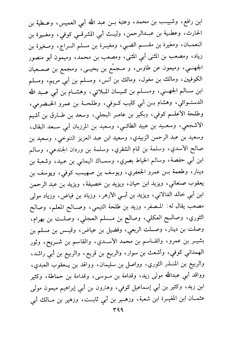ابن رافع، وشبيب بن محمد، وعتبة بن عبد الله أبي العميس، وعطية بن الحارث، وعطية بن عبد الرحمن، وليث أبي المشرقي كوفي، ومغيرة بن النعمان، ومغيرة بن مقسم الضبي، ومغيرة بن مسلم السراج، ومغيرة بن زياد، ومصعب بن المثنى أبي المثنى، ومصعب بن محمد، وميمون أبو منصور الجهني، وميمون عن طاوس، ومجمع بن يحيى، ومجمع بن صمعيان الكوفيين، ومالك بن مغول، ومالك بن أنس، ومسلم بن أبي مريم، ومسلم بن سالم الجهني، ومسلم بن كيسان الملائي، وهشام بن أبي عبد الله الدستوائي، وهشام بن أبي كليب كوفي، وطلحة بن عمرو الحضرمي، وطلحة الأعلم كوفي، وبكير بن عامر البجلي، وسعد بن طارق بن أشيم الأشجعي، وسعيد بن عبيد الطائي، وسعيد بن المرزبان أبي سعد البقال، وسعيد بن عبد الرحمن الزبيدي، وسعيد ابن عبد العزيز التنوخي، وسعيد بن صالح الأسدي، وسلمة بن تمام الشقري، وسلمة بن وردان الجندعي، وسالم بن أبي حفصة، وسالم الخياط بصري، وسماك اليماني بن عبيد، وشعبة بن دينار، وطعمة بن عمرو الجعفري، ويوسف بن صهيب كوفي، ويوسف بن يعقوب صنعاني، ويزيد ابن حيان، ويزيد بن خصيفة، ويزيد بن عبد الرحمن بن أبي خالد الدالاني، ويزيد بن أبي الأزهر، وزياد بن فياض، وزياد مولى مصعب يقال له: المصفر، وزيد بن طلحة التيمي، وصالح المعلم، وصالح الثوري، وصالح العكلي، وصالح بن مسلم العجلي، وصلت بن بهرام، وصلت بن دينار، وصلت الربعي، وفضيل بن عياض، وقيس بن مسلم بن بشير بن عمرو، والقاسم بن محمد الأسدي، والقاسم بن شريح، وثور الهمداني كوفي، وأشعث بن سوار، والربيع بن قريع، والربيع بن أبي راشد، والربيع بن المنذر الثوري، وواصل بن سليمان، وواقد بن يعقوب العبدي، وواقد أبي عبد الله مولى زيد، وقدامة بن موسى، وقدامة بن حماطة، وكثير بن زيد، وكثير بن أبي إسماعيل كوفي، وهارون بن أبي إبراهيم ميمون مولى عثمان ابن المغيرة ابن شعبة، وزهير بن أبي ثابت، وزهير بن مالك أبي