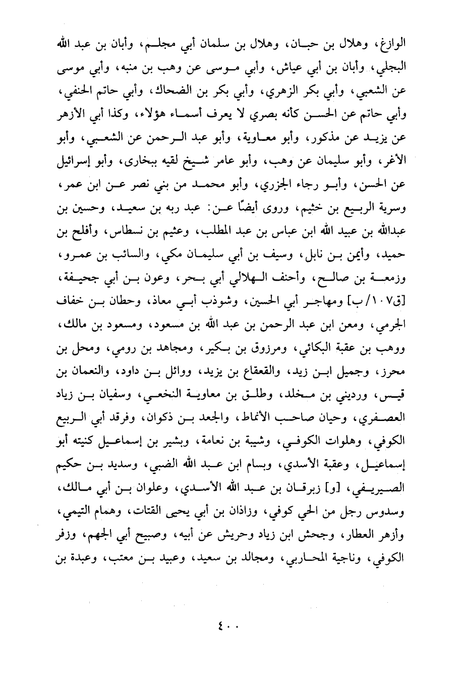 الوازغ، وهلال بن حبان، وهلال بن سلمان أبي مجلم، وأبان بن عبد الله البجلي، وأبان بن أبي عياش، وأبي موسى عن وهب بن منبه، وأبي موسى عن الشعبي، وأبي بكر الزهري، وأبي بكر بن الضحاك، وأبي حاتم الحنفي، وأبي حاتم عن الحسن كأنه بصري لا يعرف أسماء هؤلاء، وكذا أبي الأزهر عن يزيد عن مذكور، وأبو معاوية، وأبو عبد الرحمن عن الشعبي، وأبو الأغر، وأبو سليمان عن وهب، وأبو عامر شيخ لقيه ببخارى، وأبو إسرائيل عن الحسن، وأبو رجاء الجزري، وأبو محمد من بني نصر عن ابن عمر، وسرية الربيع بن خثيم، وروى أيضا عن: عبد ربه بن سعيد، وحسين بن عبد الله بن عبيد الله ابن عباس بن عبد المطلب، وعثيم بن نسطاس، وأفلح بن حميد، وأيمن بن نابل، وسيف بن أبي سليمان مكي، والسائب بن عمرو، وزمعة بن صالح، وأحنف الهلالي أبي بحر، وعون بن أبي جحيفة، [ق ١٠٧ / ب] ومهاجر أبي الحسين، وشوذب أبي معاذ، وحطان بن خفاف الجرمي، ومعن ابن عبد الرحمن بن عبد الله بن مسعود، ومسعود بن مالك، ووهب بن عقبة البكائي، ومرزوق بن بكير، ومجاهد بن رومي، ومحل بن محرز، وجميل ابن زيد، والقعقاع بن يزيد، ووائل بن داود، والنعمان بن قيس، ورديني بن مخلد، وطلق بن معاوية النخعي، وسفيان بن زياد العصفري، وحيان صاحب الأنماط، والجعد بن ذكوان، وفرقد أبي الربيع الكوفي، وهلوات الكوفي، وشيبة بن نعامة، وبشير بن إسماعيل كنيته أبو إسماعيل، وعقبة الأسدي، وبسام ابن عبد الله الضبي، وسديد بن حكيم الصيريفي، (و) زبرقان بن عبد الله الأسدي، وعلوان بن أبي مالك، وسدوس رجل من الحي كوفي، وزاذان بن أبي يحيى القتات، وهمام التيمي، وأزهر العطار، وجحش ابن زياد وحريش عن أبيه، وصبيح أبي الجهم، وزفر الكوفي، وناجية المحاربي، ومجالد بن سعيد، وعبيد بن معتب، وعبدة بن