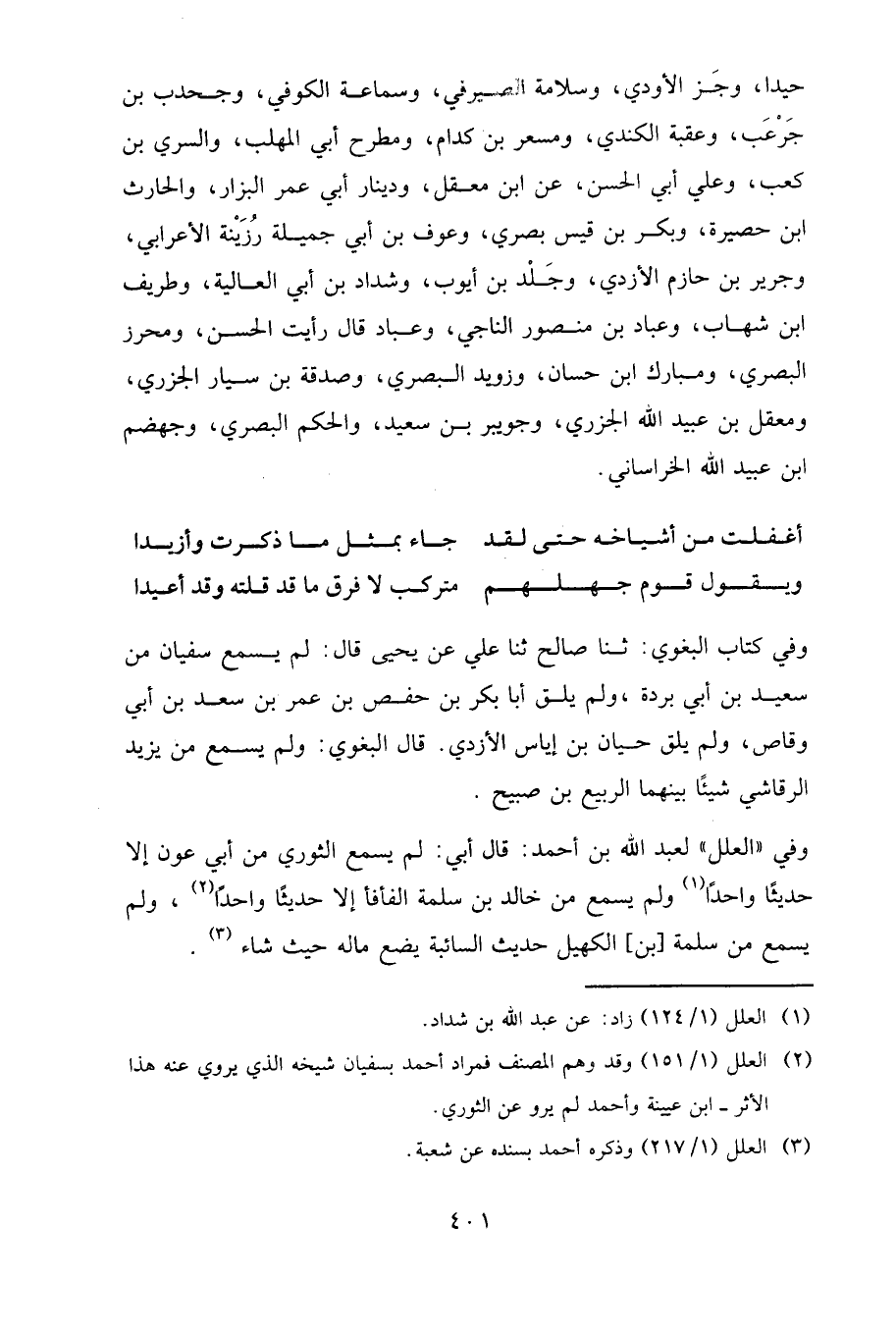 وفي «العلل» لعبد الله بن أحمد: قال أبي: لم يسمع الثوري من أبي عون إلا حديثا واحدا ولم يسمع من خالد بن سلمة الفأفأ إلا حديثا واحدا، ولم يسمع من سلمة (بن) الكهيل حديث السائبة يضع ماله حيث شاء.