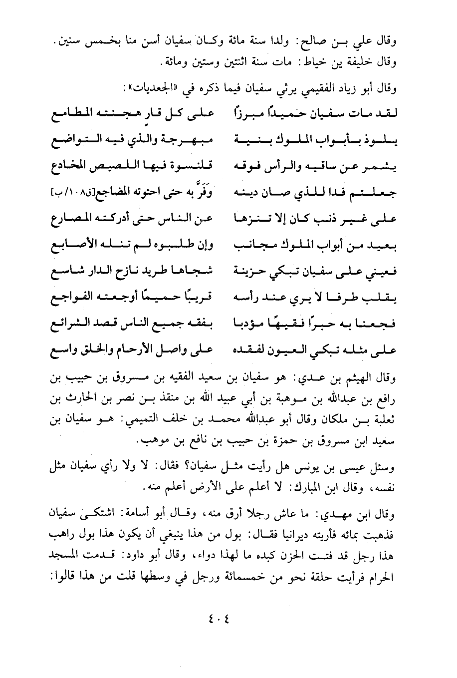 وقال أبو زياد الفقيمي يرثي سفيان فيما ذكره في «الجعديات»: