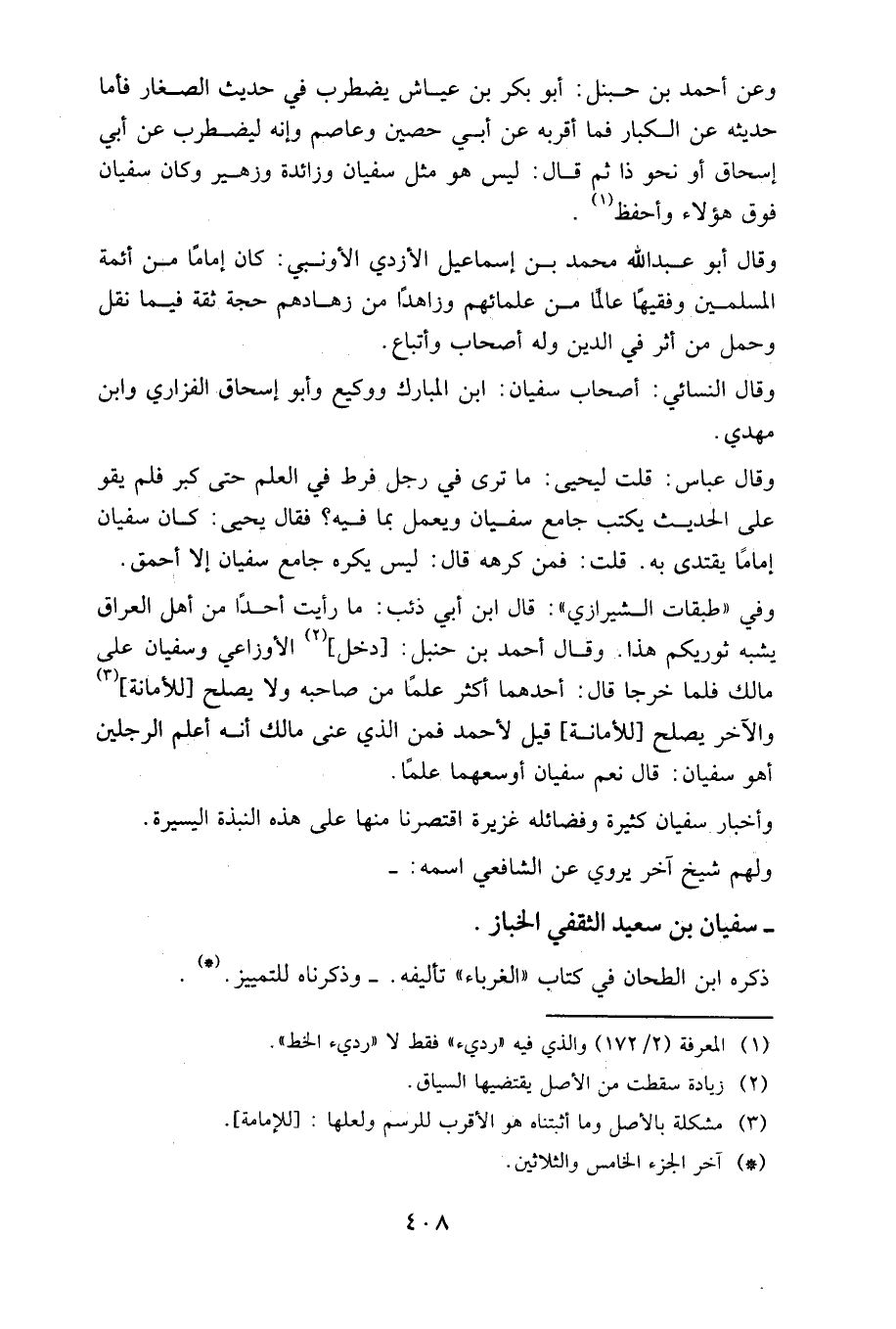 وفي «طبقات الشيرازي»: قال ابن أبي ذئب: ما رأيت أحدا من أهل العراق يشبه ثوريكم هذا. وقال أحمد بن حنبل: (دخل) الأوزاعي وسفيان على مالك فلما خرجا قال: أحدهما أكثر علما من صاحبه ولا يصلح (للأمانة) والآخر يصلح (للأمانة) قيل لأحمد فمن الذي عنى مالك أنه أعلم الرجلين أهو سفيان: قال نعم سفيان أوسعهما علما.
