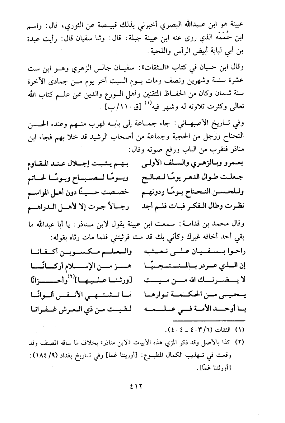 وقال ابن حبان في كتاب «الثقات»: سفيان جالس الزهري وهو ابن ست عشرة سنة وشهرين ونصف ومات يوم السبت آخر يوم من جمادى الآخرة سنة ثمان وكان من الحفاظ المتقين وأهل الورع والدين ممن علم كتاب الله تعالى وكثرت تلاوته له وشهر فيه [ق ١١٠ / ب].