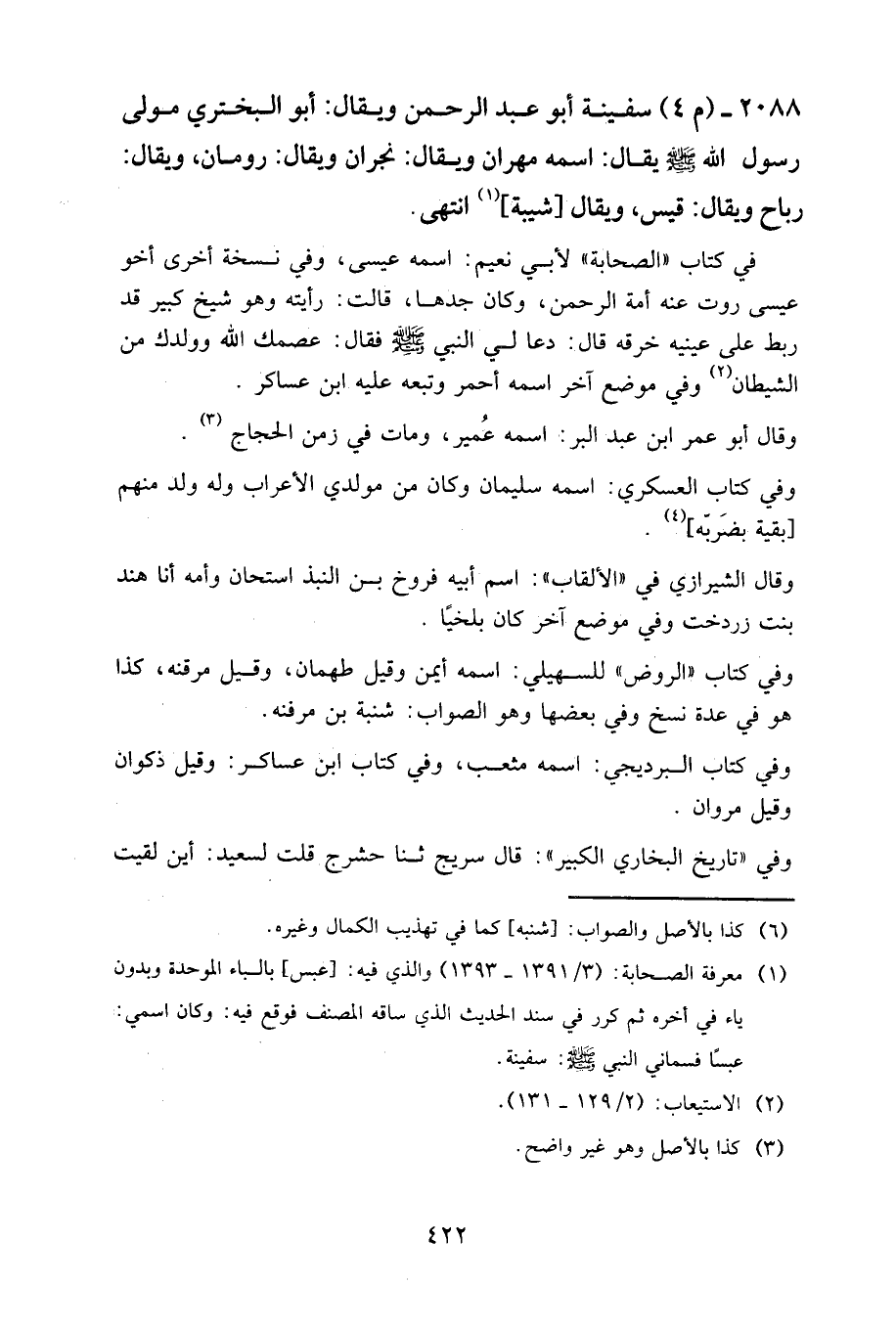 ٢٠٨٨ - (م ٤) سفينة أبو عبد الرحمن ويقال: أبو البختري مولى رسول الله صلى الله عليه وسلم يقال: اسمه مهران ويقال: نجران ويقال: رومان، ويقال: رباح ويقال: قيس، ويقال (شيبة) انتهى.