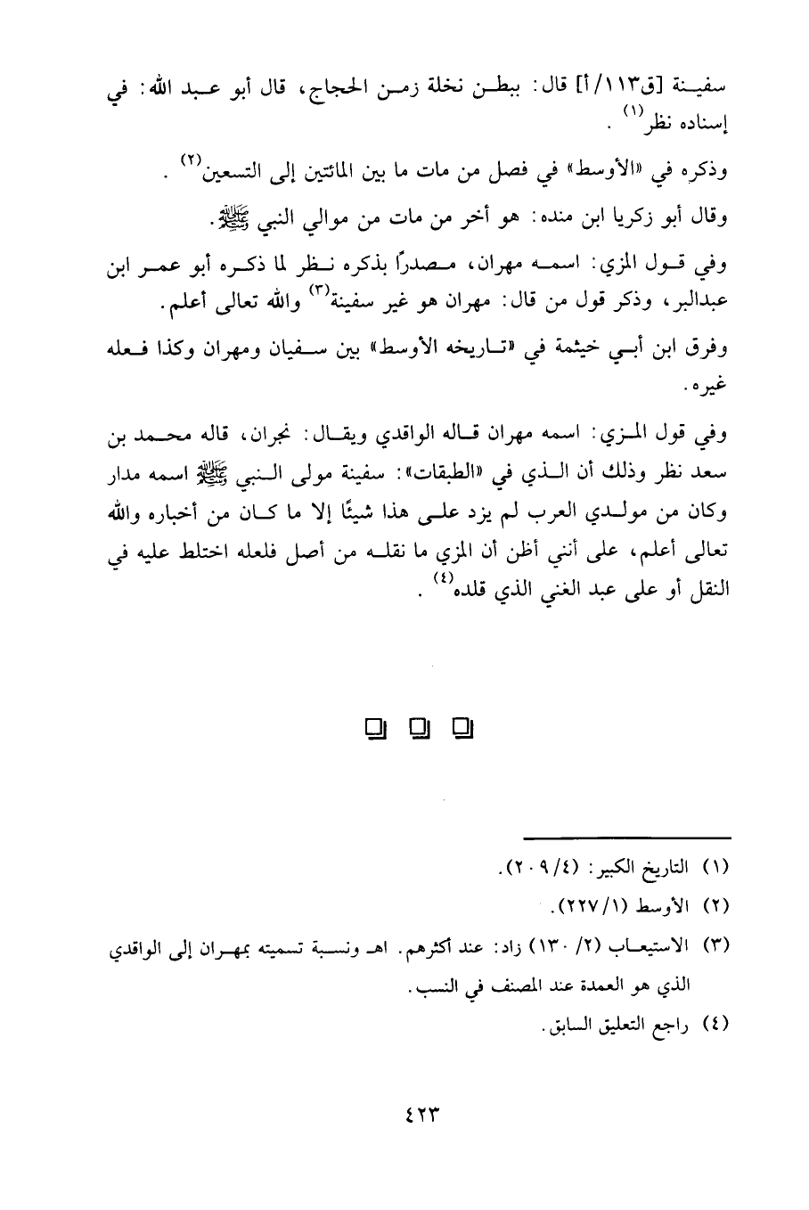 وفي قول المزي: اسمه مهران قاله الواقدي ويقال: نجران، قاله محمد بن سعد نظر وذلك أن الذي في «الطبقات»: سفينة مولى النبي صلى الله عليه وسلم اسمه مدار وكان من مولدي العرب لم يزد على هذا شيئا إلا ما كان من أخباره والله تعالى أعلم، على أنني أظن أن المزي ما نقله من أصل فلعله اختلط عليه في النقل أو على عبد الغني الذي قلده.