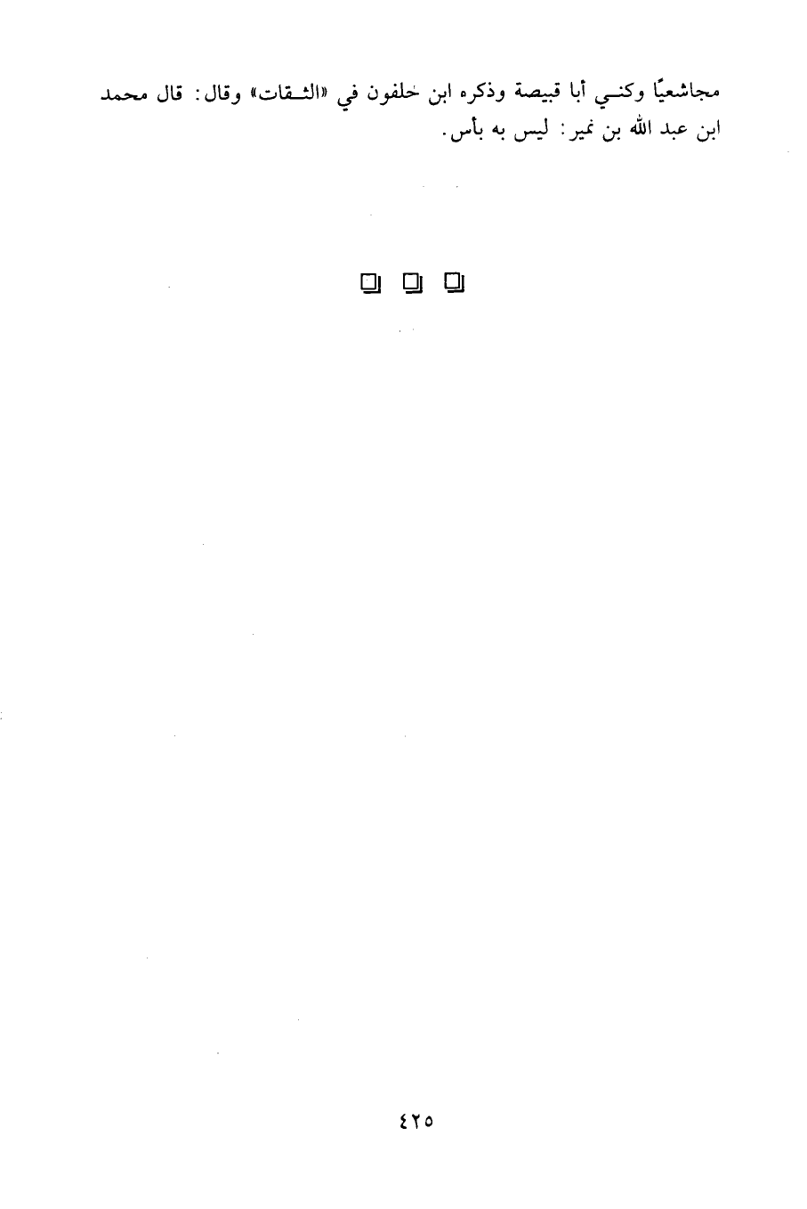 مجاشعيا وكني أبا قبيصة وذكره ابن خلفون في «الثقات» وقال: قال محمد بن عبد الله بن نمير: ليس به بأس.