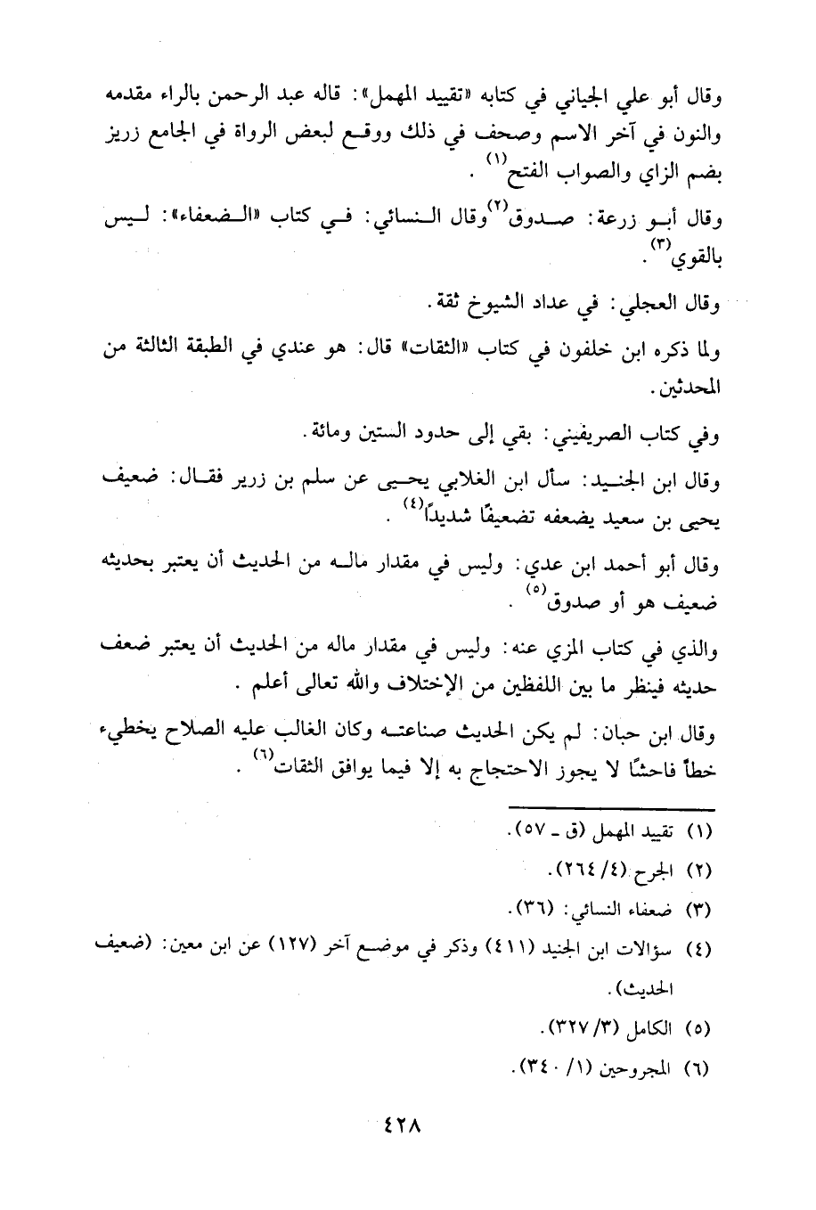 وقال أبو علي الجياني في كتابه «تقييد المهمل»: قاله عبد الرحمن بالراء مقدمه والنون في آخر الاسم وصحف في ذلك ووقع لبعض الرواة في الجامع زريز بضم الزاي والصواب الفتح.