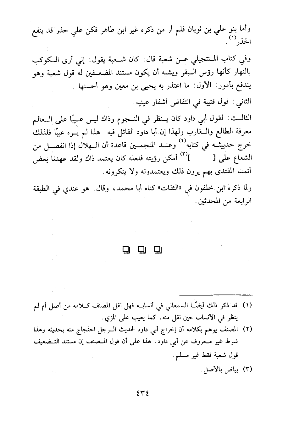 الثالث: لقول أبي داود كان ينظر في النجوم وذاك ليس عيبا على العالم معرفة الطالع والغارب ولهذا إن أبا داود القائل فيه: هذا لم يره عيبا فلذلك خرج حديثيه في كتابه وعند المنجمين قاعدة أن الهلال إذا انفصل من الشعاع على () أمكن رؤيته فلعله كان يعتمد ذاك ولقد عهدنا بعض أئمتنا المقتدى بهم يرون ذلك ويعتمدونه ولا ينكرونه.