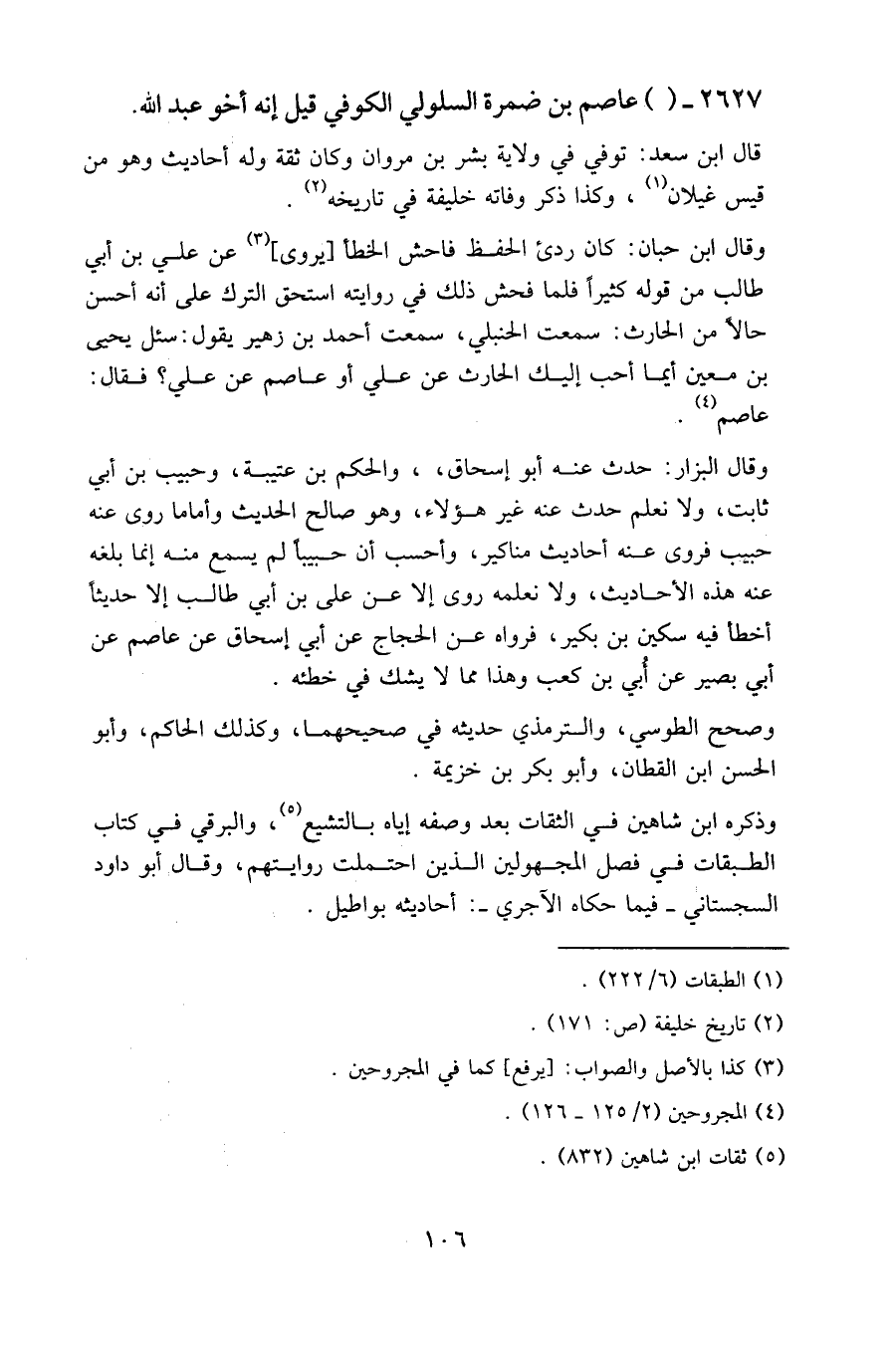 ٢٦٢٧ - () عاصم بن ضمرة السلولي الكوفي قيل إنه أخو عبد الله.