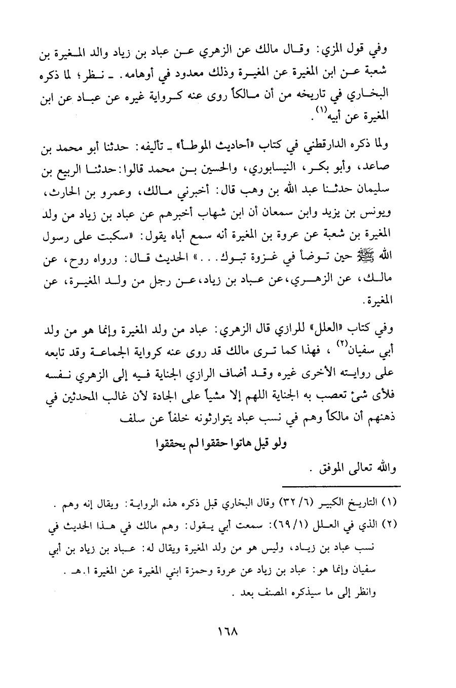 وفي كتاب " العلل " للرازي قال الزهري: عباد من ولد المغيرة وإنما هو من ولد أبي سفيان، فهذا كما ترى مالك قد روى عنه كرواية الجماعة وقد تابعه على روايته الأخرى غيره وقد أضاف الرازي الجناية فيه إلى الزهري نفسه فلأي شيء تعصب به الجناية اللهم إلا مشيا على الجادة لأن غالب المحدثين في ذهنهم أن مالكا وهم في نسب عباد يتوارثونه خلفا عن سلف.