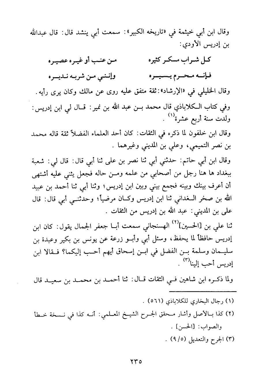 وقال ابن أبي خيثمة في " تاريخه الكبير ": سمعت أبي ينشد قال: قال عبد الله بن إدريس الأودي: