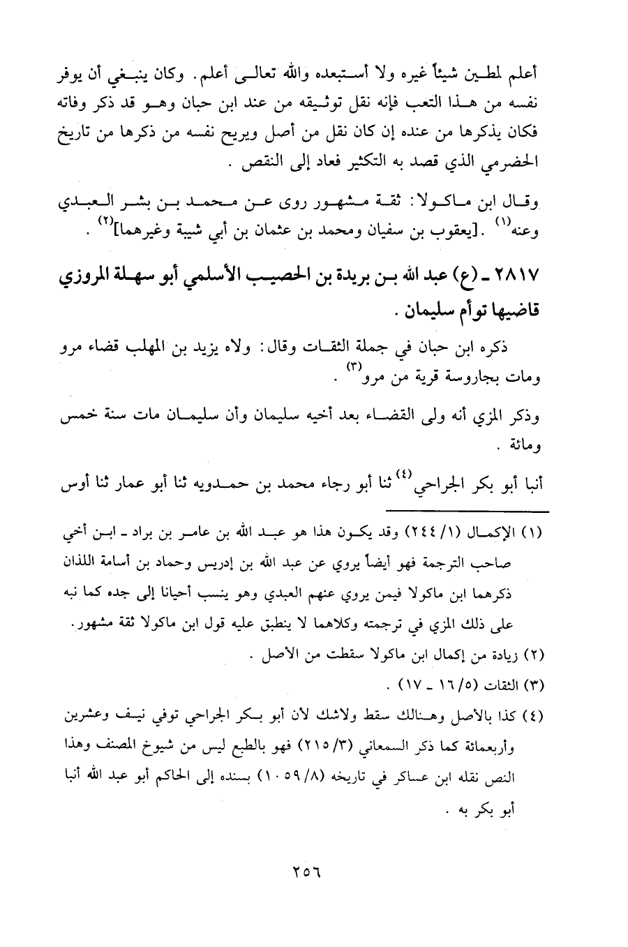 أعلم لمطين شيئا غيره ولا أستبعده والله تعالى أعلم. وكان ينبغي أن يوفر نفسه من هذا التعب فإنه نقل توثيقه من عند ابن حبان وهو قد ذكر وفاته فكان يذكرها من عنده إن كان نقل من أصل ويريح نفسه من ذكرها من تاريخ الحضرمي الذي قصد به التكثير فعاد إلى النقص.
